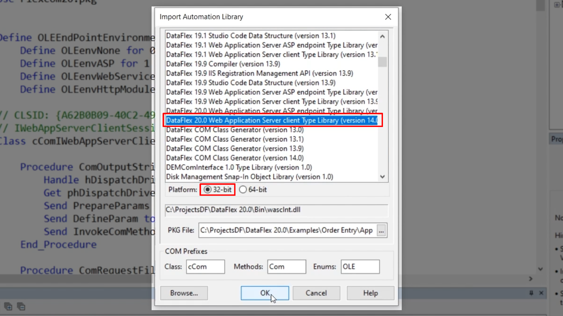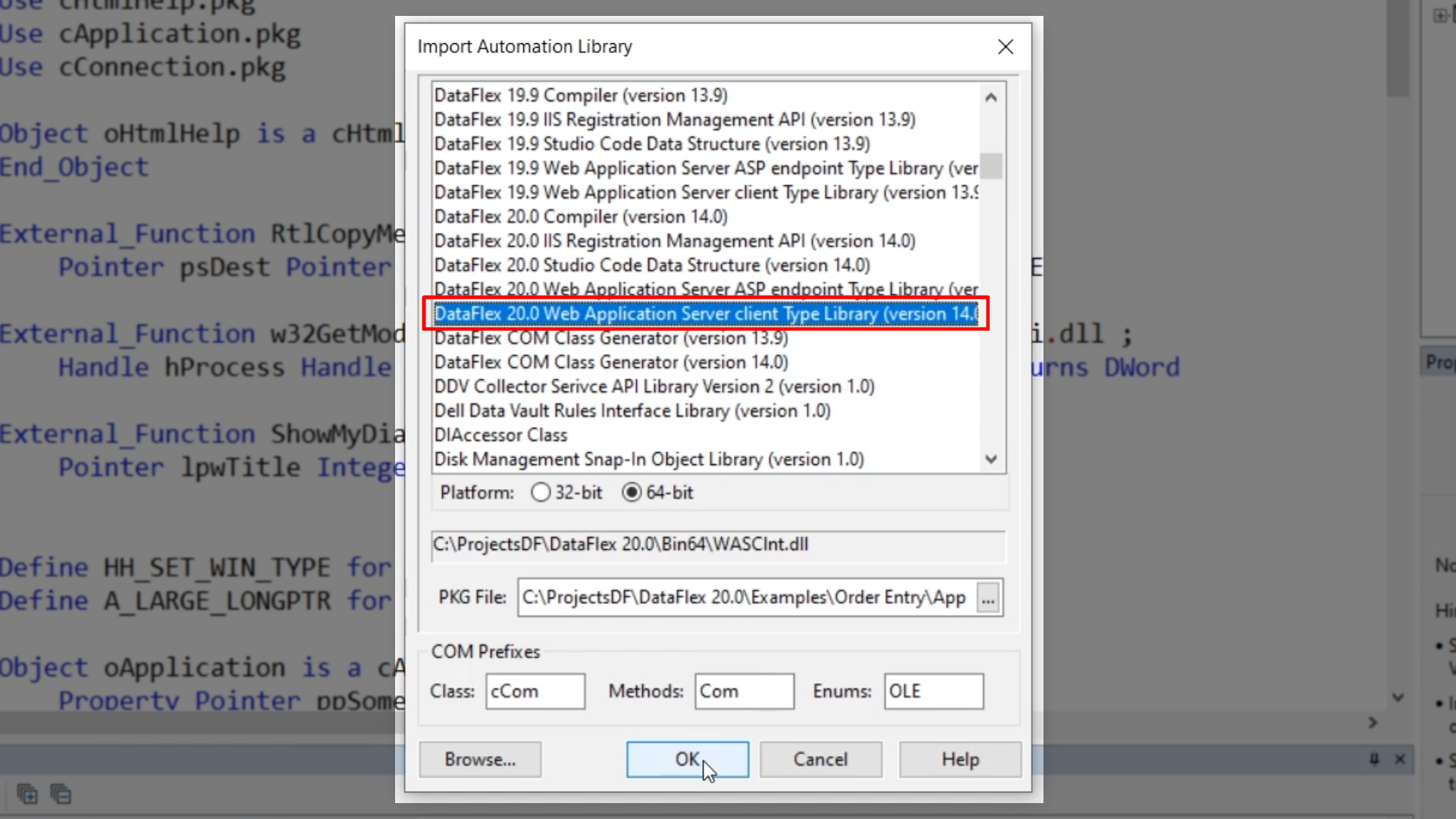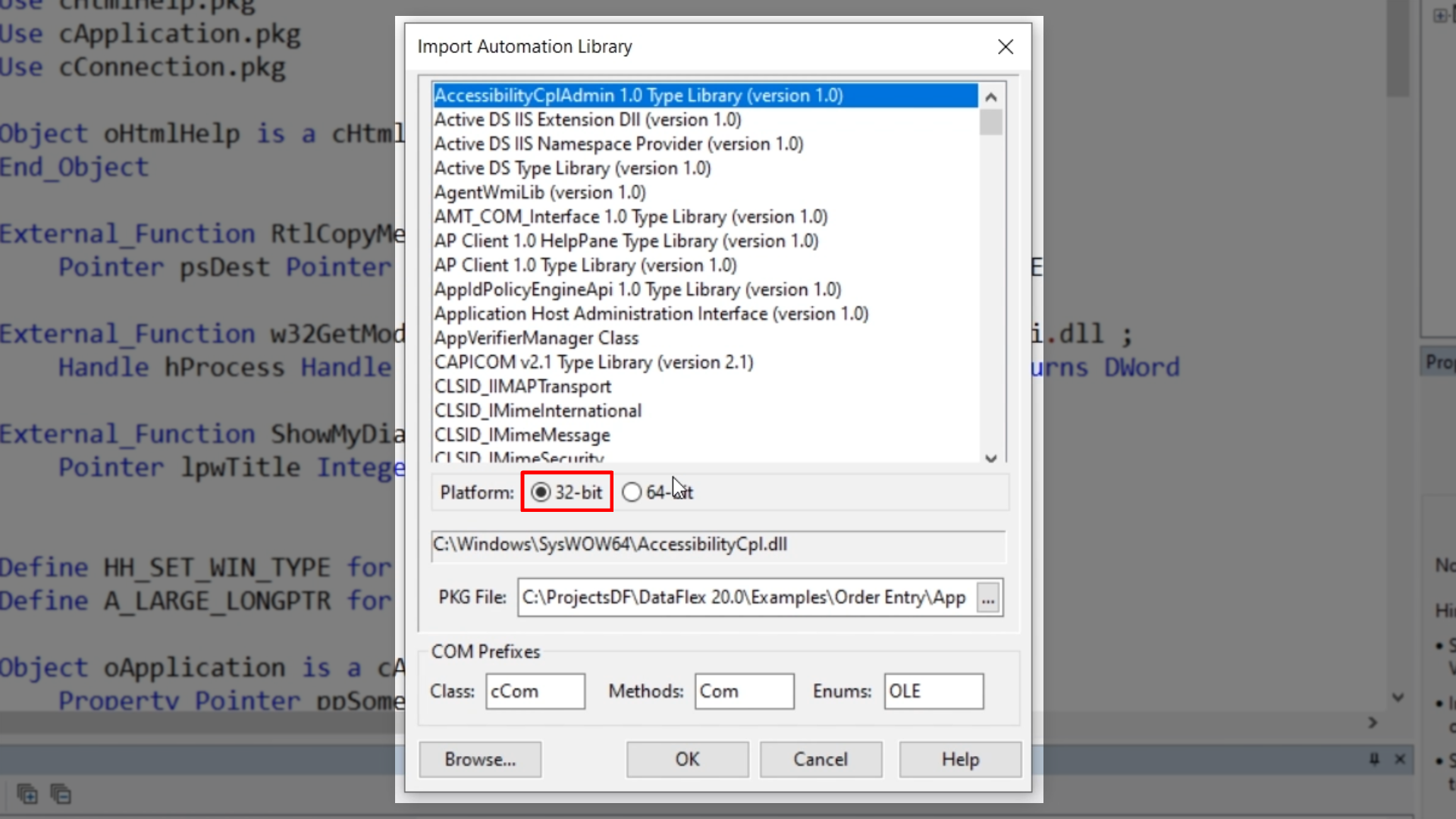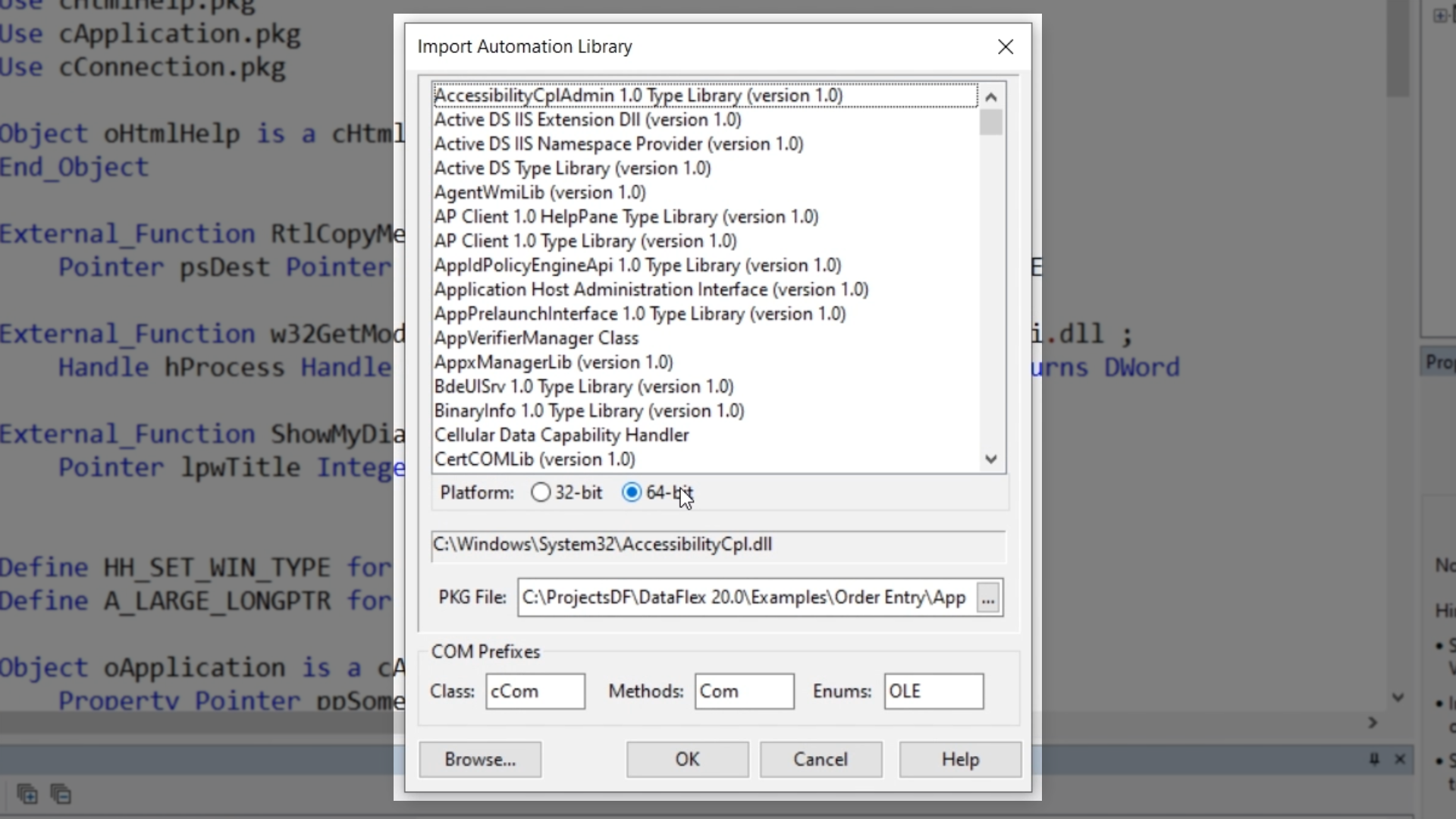 - A list with available COM objects pops up. Check that the selected platform is the one needed the project. Currently it only lists the 64-bit COM objects. If 32-bit is selected, then the list of 32-bit COM objects is shown. The resulting 32-bit and 64-bit classes can be the same. In fact, they often are.