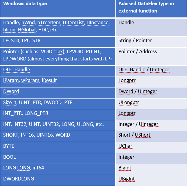 - Here is a list of often used Windows datatypes, and which datatype should be used in DataFlex.