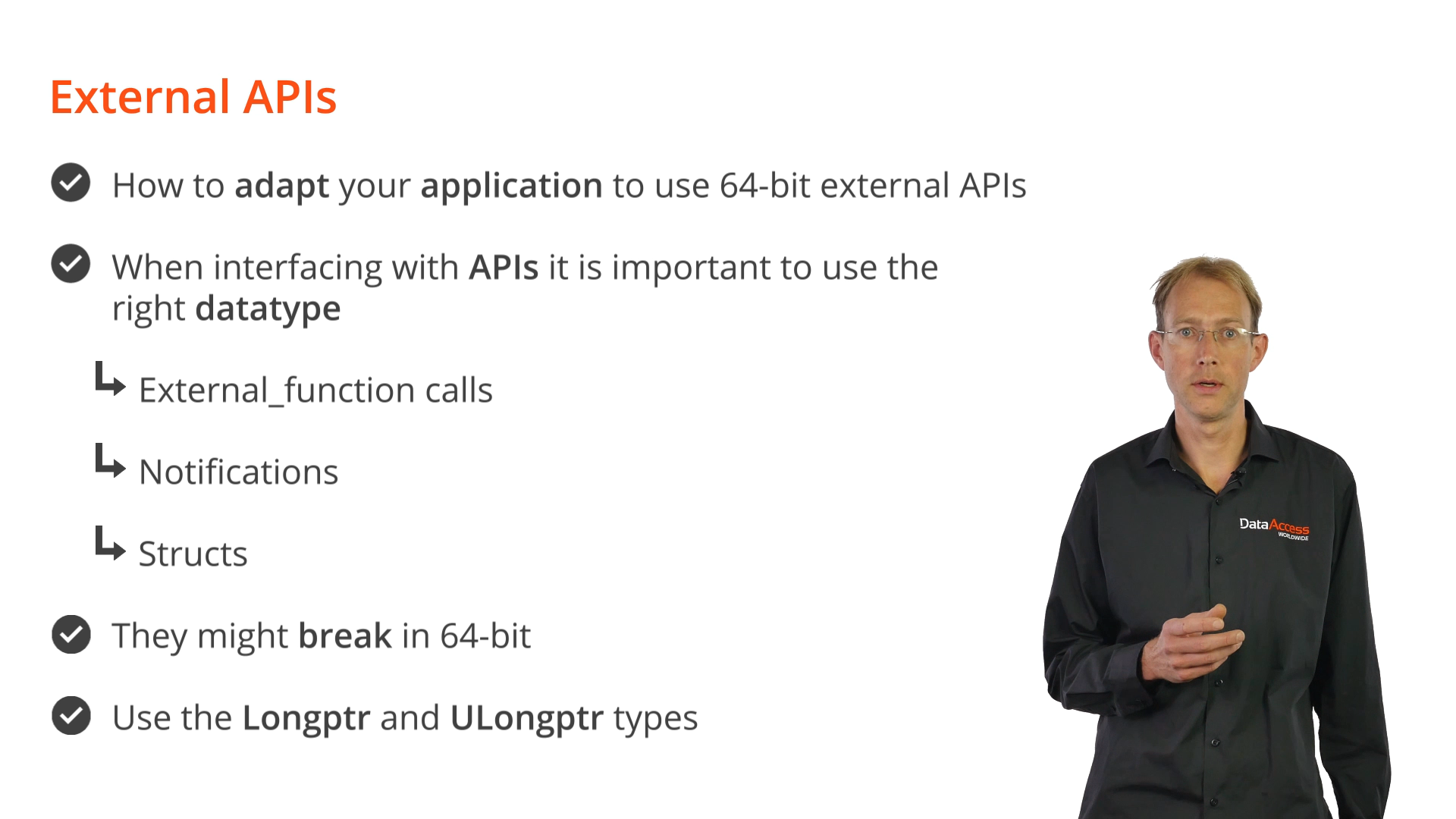 The next step in this course is to learn how to adapt applications to use 64-bit external APIs. It is important to use the right datatype when interfacing with Windows and other external APIs. This includes the External_function calls, notifications and structs that are passed. All of these may work in 32-bit but might break in 64-bit. Longptr and ULongptr types will be needed for interfacing platform dependent integer types, such as the C/C++ types, INT_PTR, LRESULT, WPARAM, ULONG_PTR, Size_t, etc.