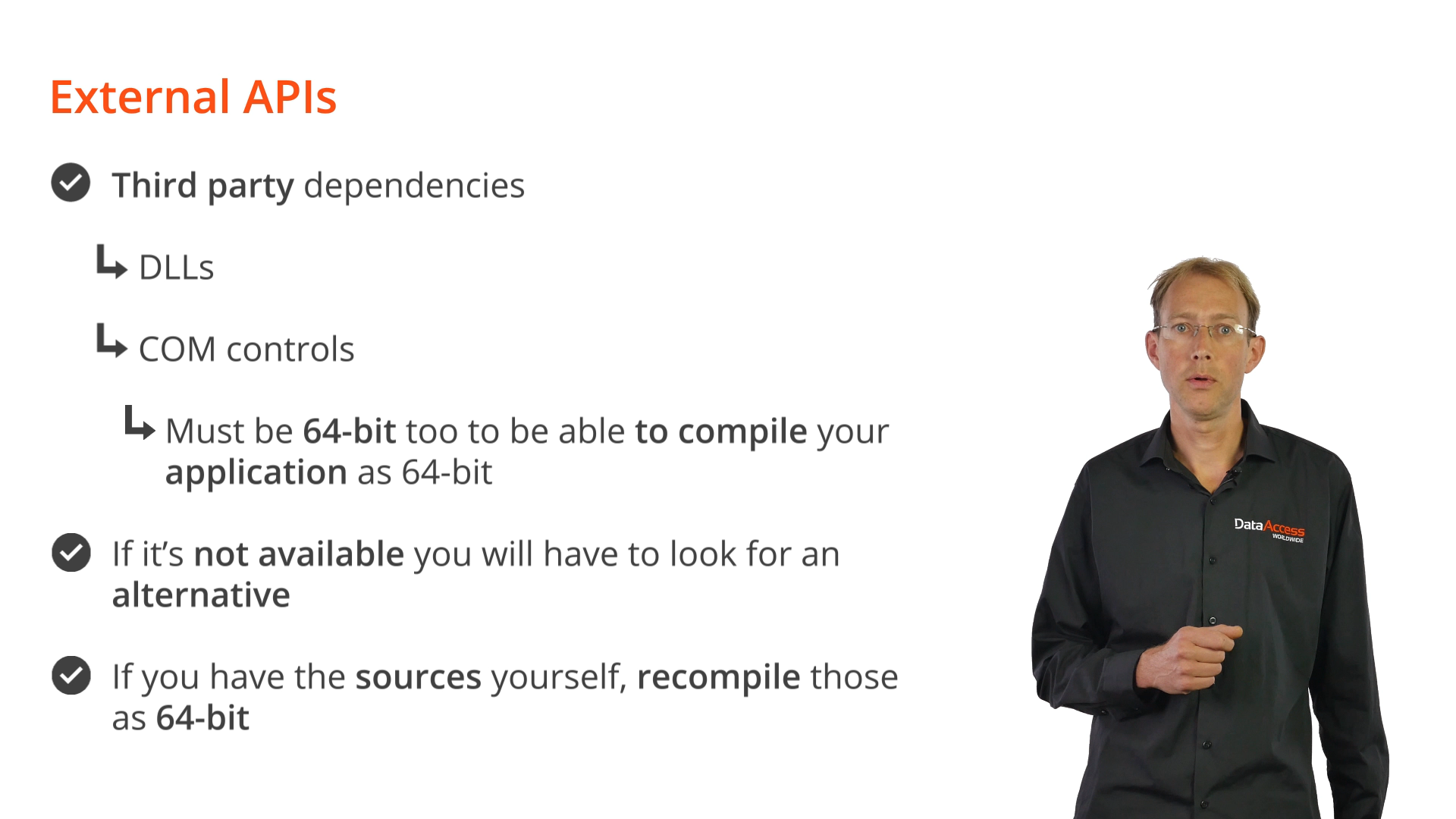 - Third party dependencies, such as DLLs and COM controls, must be 64-bit to be able to compile an application as 64-bit. It may need to be downloaded, but an alternative may need to be found if one is not available. If the source is available, recompile it as 64-bit.