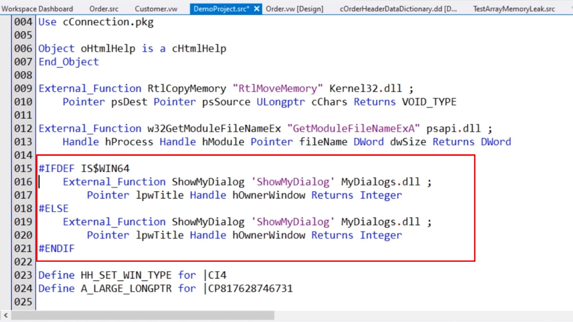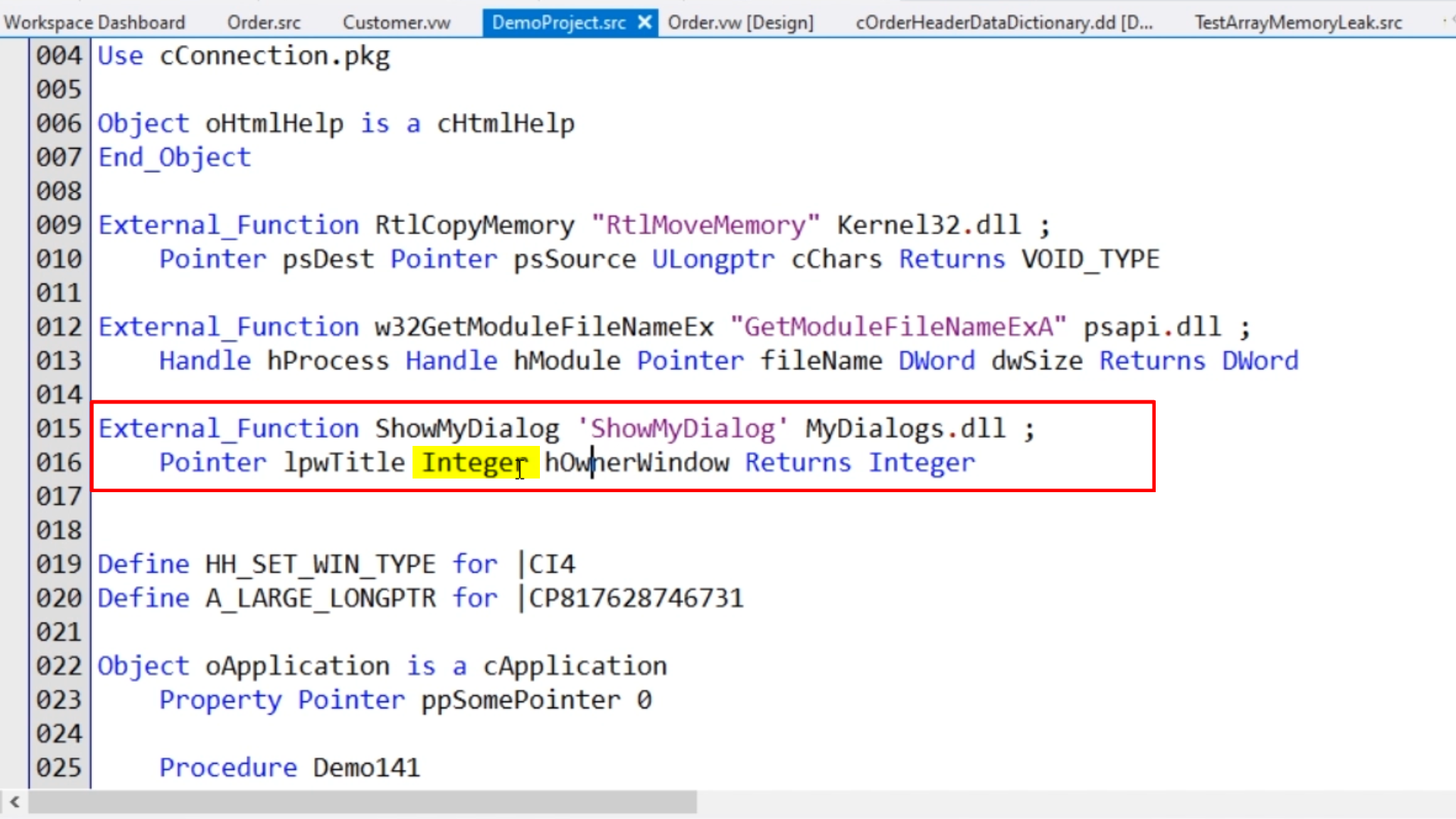 - Shown is an External_function called ShowMyDialog, which is called from the MyDialogs.dll with a mistake; the second parameter should be a Handle, not Integer.