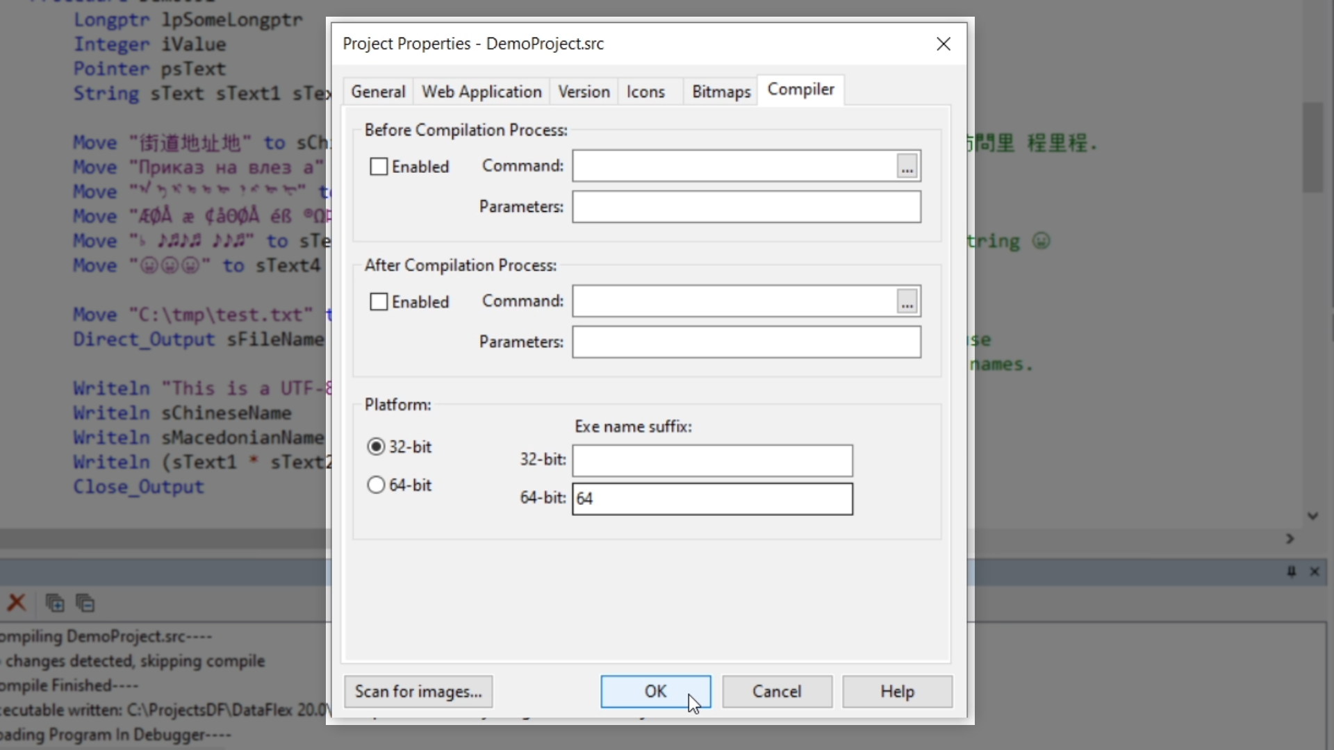 This can also be achieved from the menu. Go to Project > Project Properties and select the ‘Compiler’ tab. Here the executable name suffix can also be set. In this case, the 32-bit suffix is empty, which means that the executable gets the name of the project.