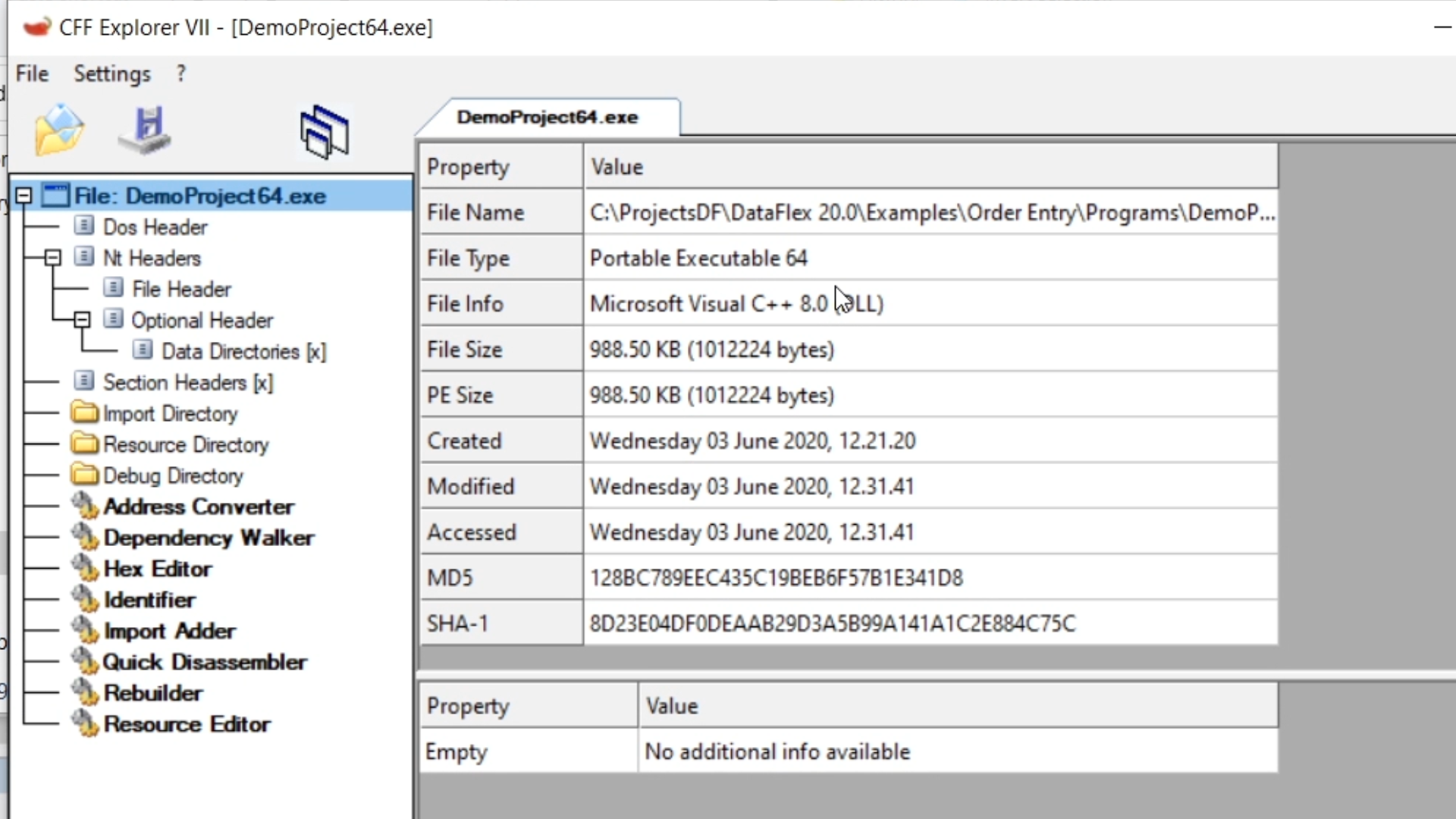 Right clicking on an executable, and selecting ‘Open with CFF Explorer’ will further show that this executable is really 64-bit.