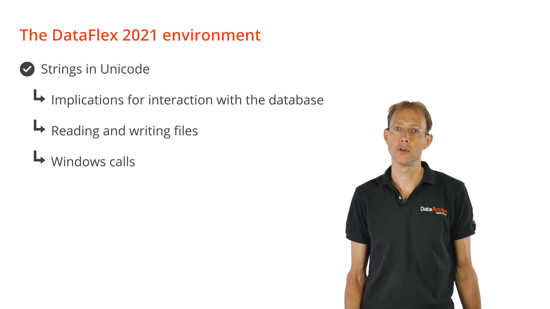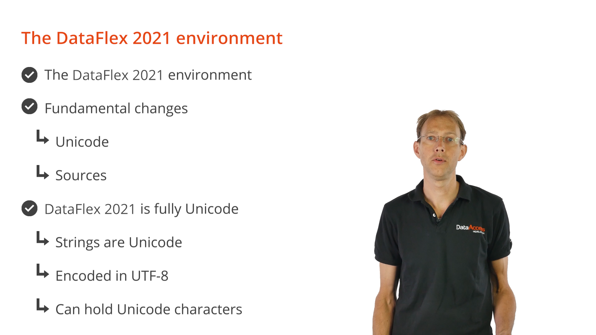 DataFlex is now fully Unicode, which means that all strings are Unicode, encoded in UTF-8, and can hold Unicode characters.