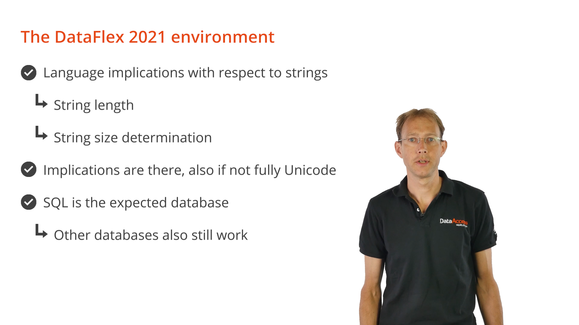 The fact that DataFlex has become fully Unicode also has some language implications with respect to strings, such as string length and size determination. These factors need to be considered, whether or not an application is fully Unicode.