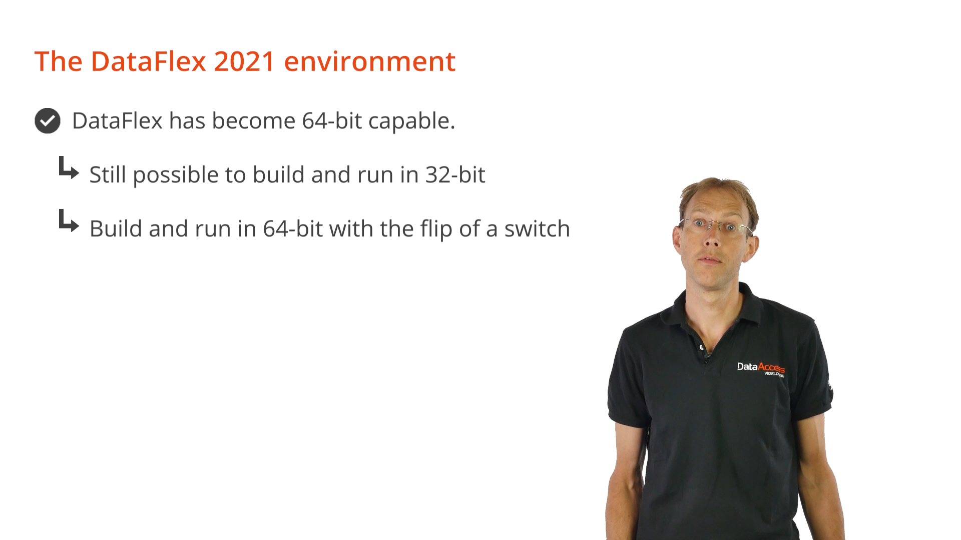 DataFlex has also become 64-bit capable. This means applications can still be built and run in 32-bit mode, but the option to pull the switch to build and run 64-bit is there.