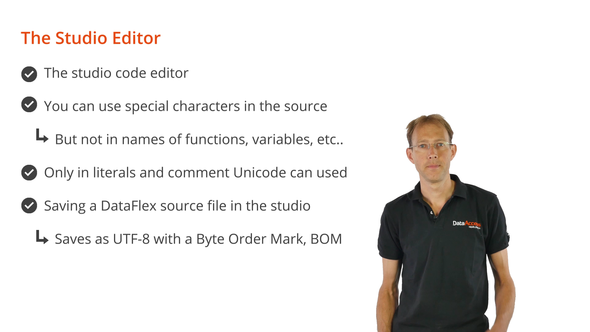 When saving a DataFlex source file in the Studio, it saves it as UTF-8 with a Byte Order Mark (BOM).