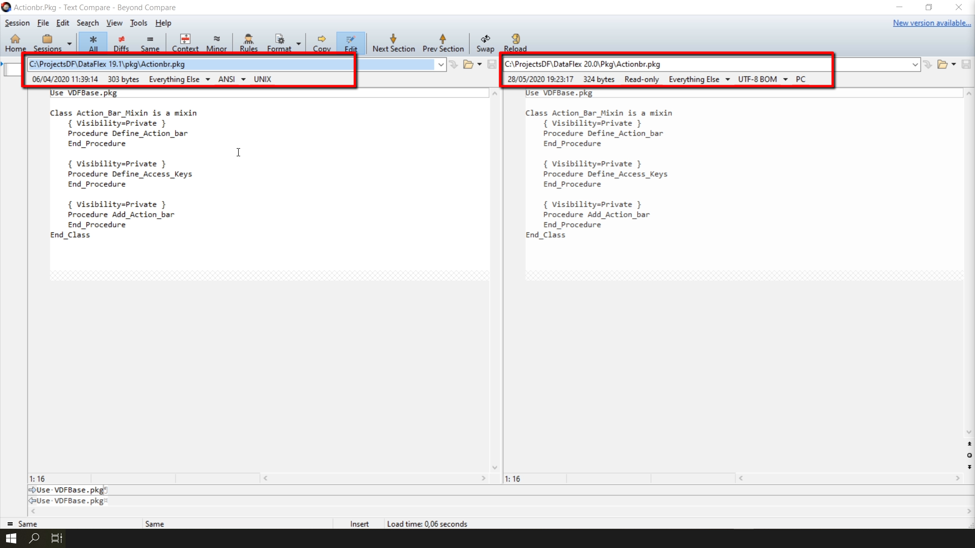 This comparison tool shows the difference between a file from the packages folder in DataFlex 19.1 and in DataFlex 2021. The only difference here is the UTF-8 BOM, which is a set of three bytes at the beginning of the file. These three bytes are not shown in this editor and are also not shown in the Studio editor.