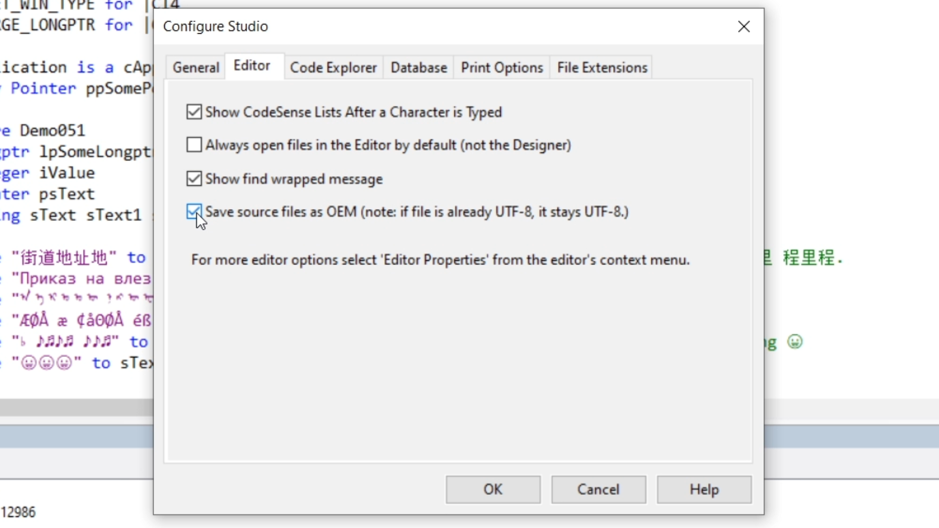 Typically, this option is switched off. All files will now be saved as UTF-8 again. To turn it off, select the Tools menu > Configure Studio > Editor Tab > DESELECT ‘Save source files as OEM’.