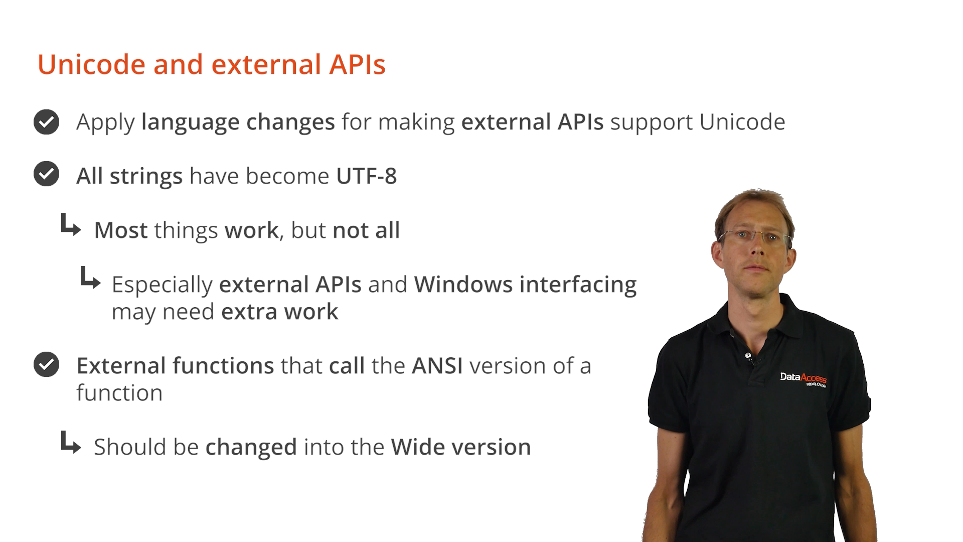 If ANSI functions are still being used, it will still work in many cases, but non-ASCII characters will not display correctly; they may show up as question marks. Since strings in DataFlex are UTF-8, conversions are needed between UTF-8 and UTF-16 for communicating with Windows functionality. For DataFlex packages and tools, the changes have been made.