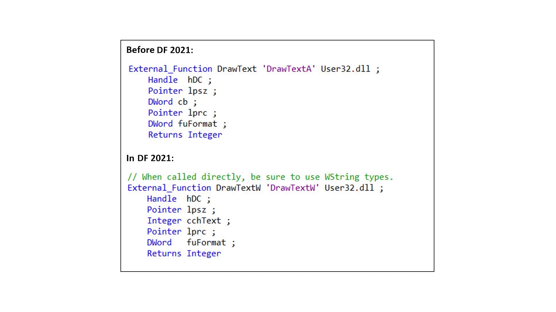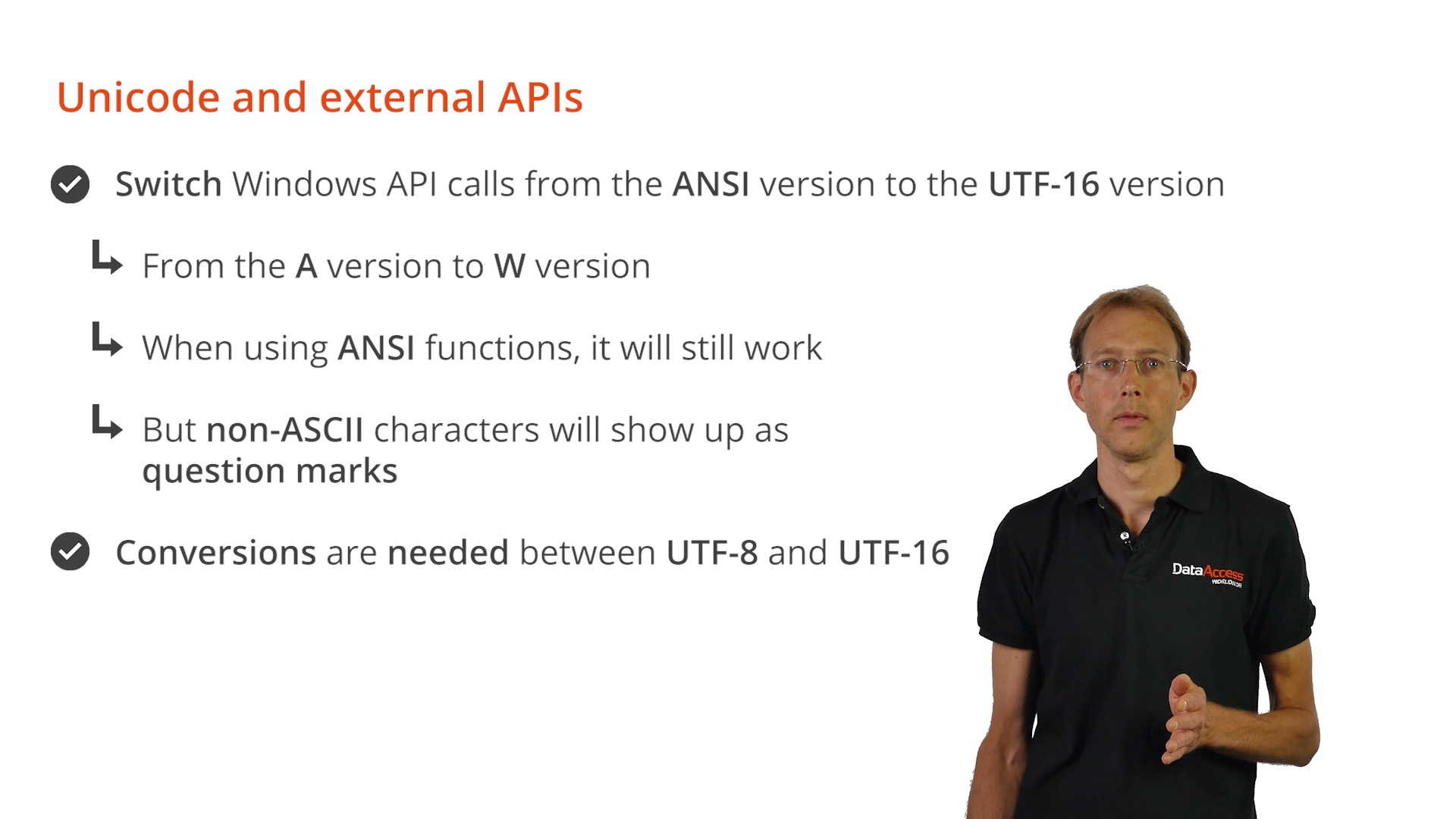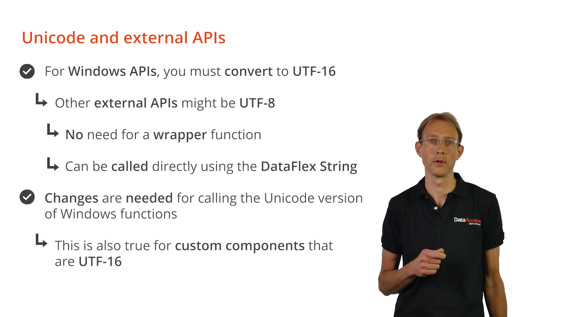 - Windows APIs must be converted to UTF-16. If other external APIs that are used might be UTF-8. In that case, a wrapper function is not needed, and it can be called directly using the DataFlex string.