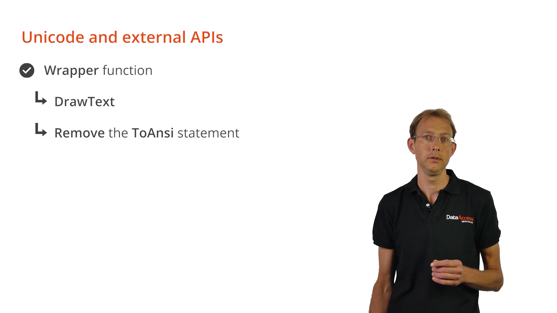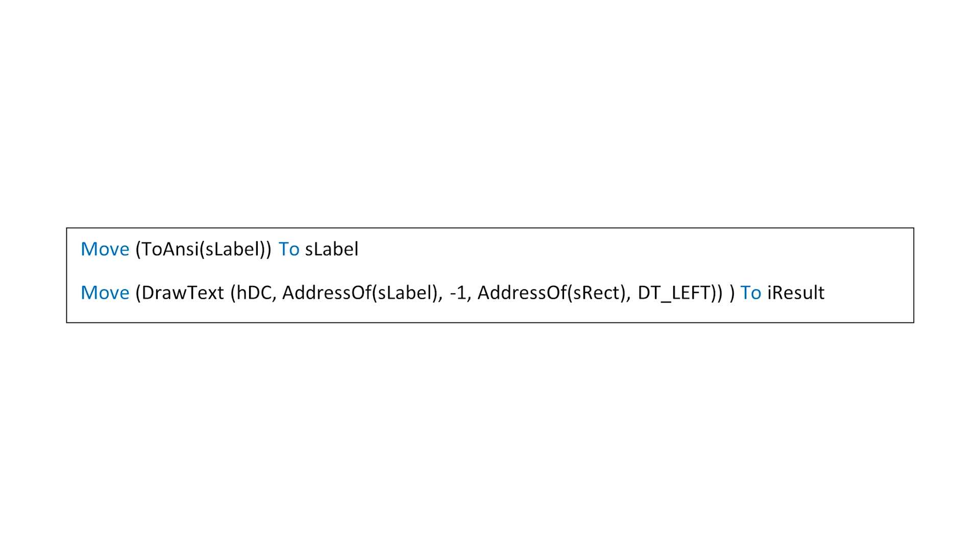 The ‘sLabel’ variable is converted from OEM to ANSI before its pointer is passed to the ‘DrawText’ function. The wrappers for many Windows functions have been created to limit the number of changes that will need to be made. There is a wrapper function for ‘DrawText,’ which means that the call to ‘DrawText’ is unchanged. It would still work, and support Unicode, but at the very least, the ToAnsi statement must be removed because the ANSI version is not being called. The Unicode version is.