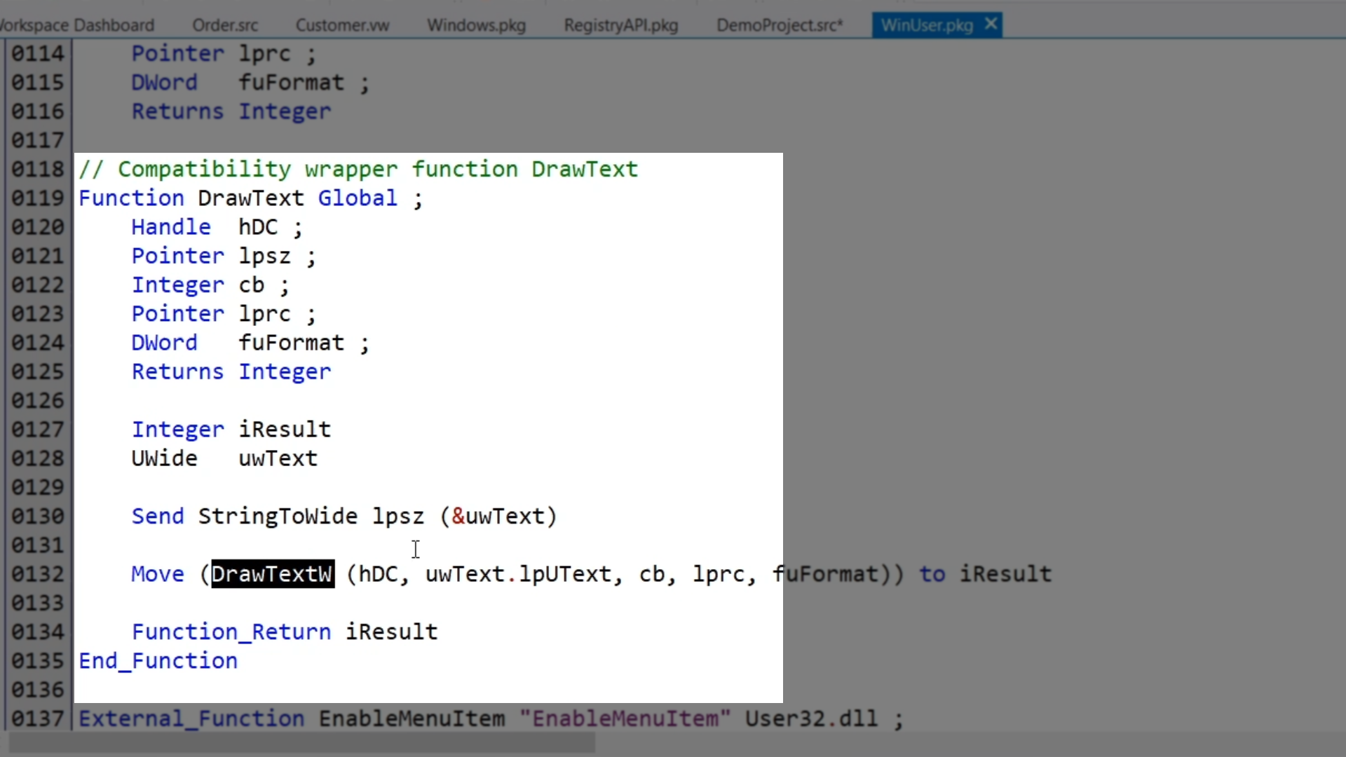 - Now, it works well, but instead of calling the wrapper function, the code could be changed to call the DrawTextW external function directly. If done, it must be called with a pointer to a wide string.