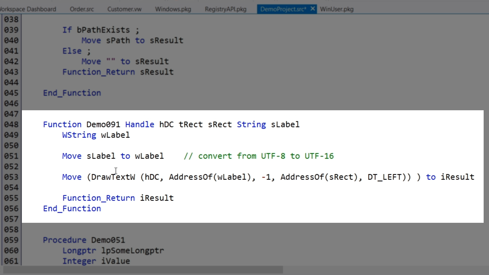 - The second line converts a DataFlex string, which is UTF-8, to a UTF-16 string, by a simple move statement. The last line calls the DrawTextW external function directly, with a pointer to the WString variable.