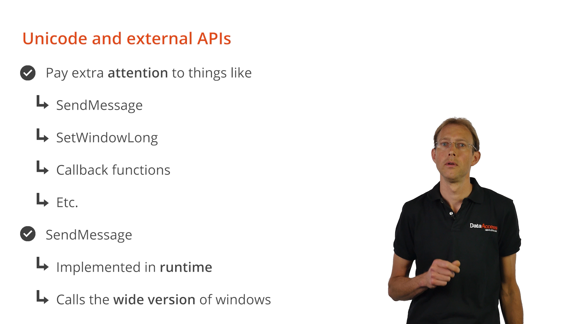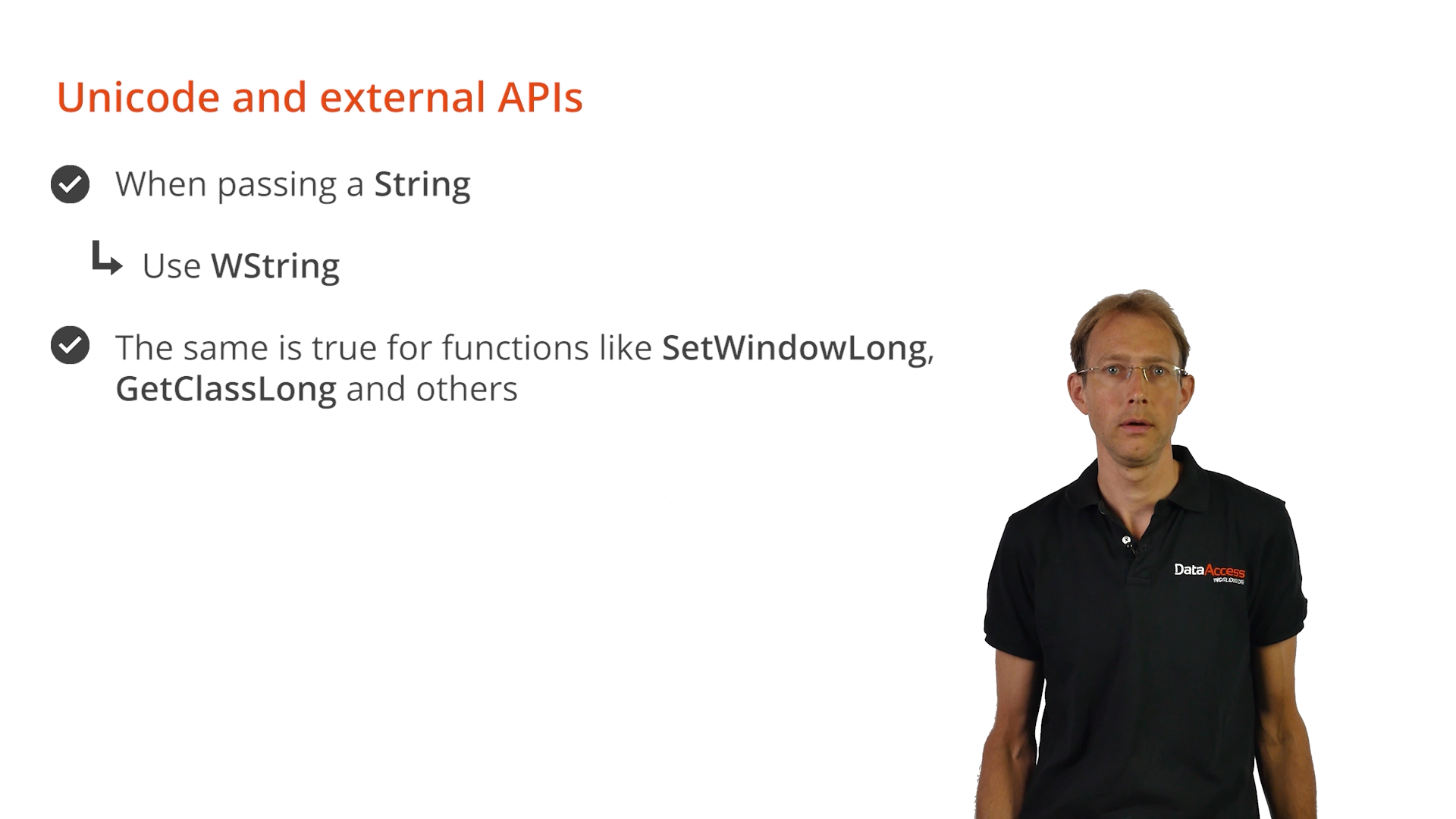 - The example shown illustrated the kind of changes that need to be made for calling the Unicode version of Windows functions. This is also true for custom components that are UTF-16.