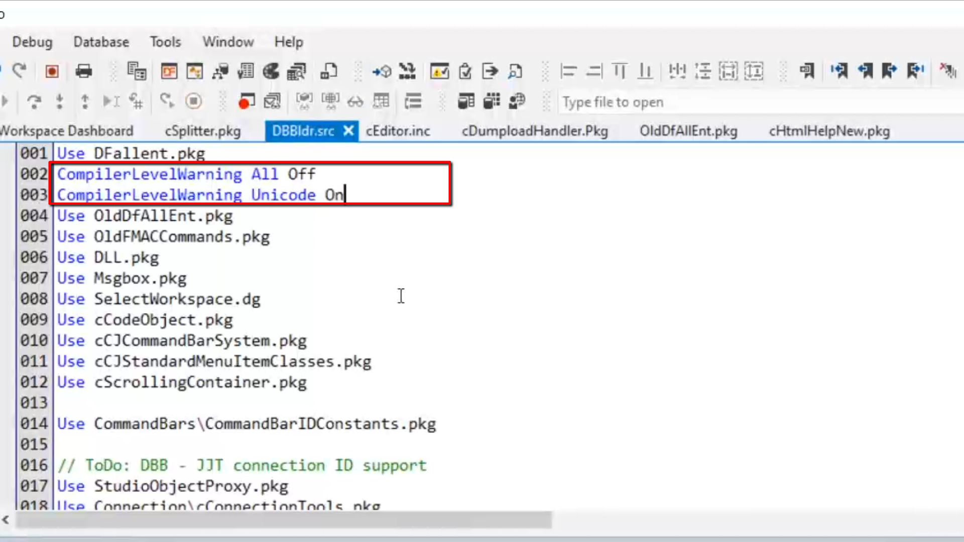 - The command, CompilerLevelWarning, can be used after including the Dfallent.pkg. By default all warnings are on. Adding this code and compiling reduces the number of warnings from over 3,000 to 441. Most of them are about the TYPE structure. Each will need to be reviewed and changed to STRUCTs.