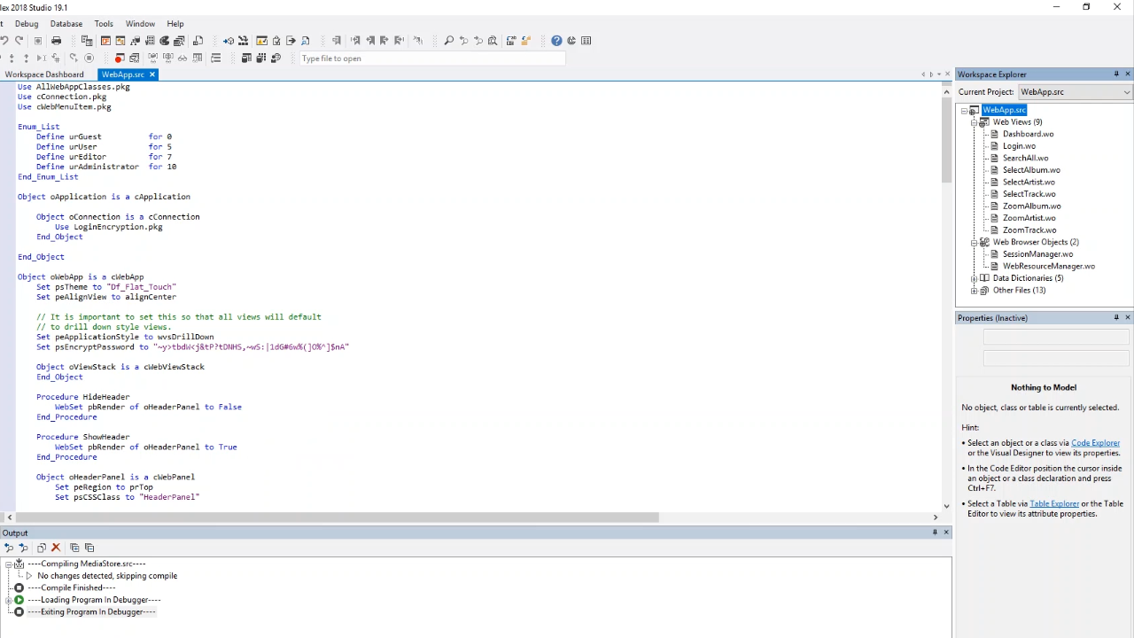 - Open ‘WebApp.src’ from the Workspace Explorer on the right. The code shows that in the application data is going to be constrained based on which user logs in.