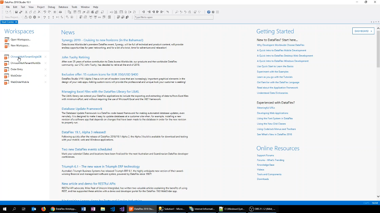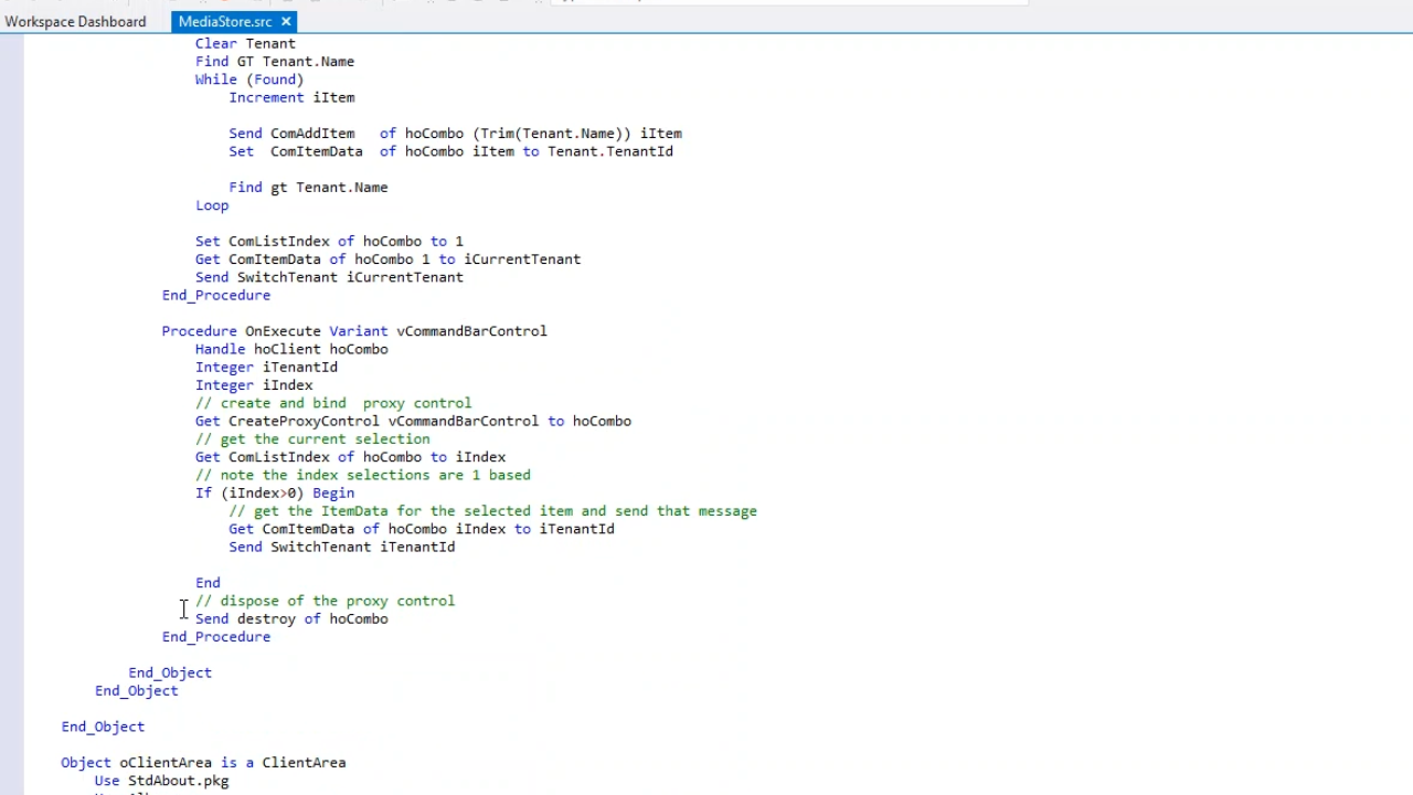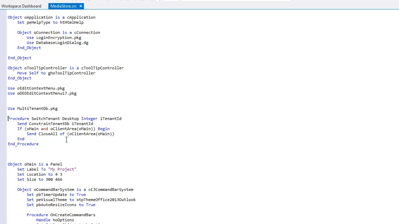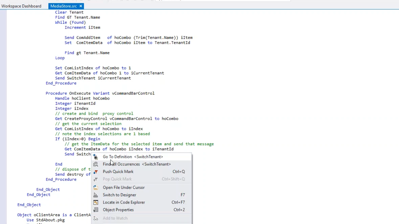 In the DataFlex Studio, double clicking on the combo displays its code. It shows that the tenant selection menu item, and that on creation it fills the combo list. When an item is clicked it is going into ‘SwitchTenant.’ Drilling into SwitchTenant (right click on it and select ‘Go To Definition’) shows that it is a global procedure that first calls a function called ‘ConstrainTenantDb’ with the TenantId. Then it calls a function that clears all of the views.