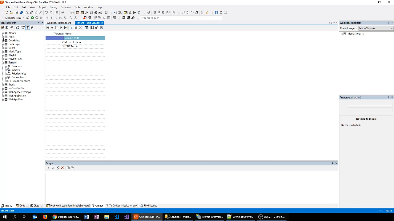 The workspace also includes a Windows application called ‘MediaStore.src.’ Its main view is ‘Albums,’ which shows albums with the related artists and tracks. MediaStore.src also displays an additional combo, which shows the available tenants. This allows different tenants to be selected while using the application.