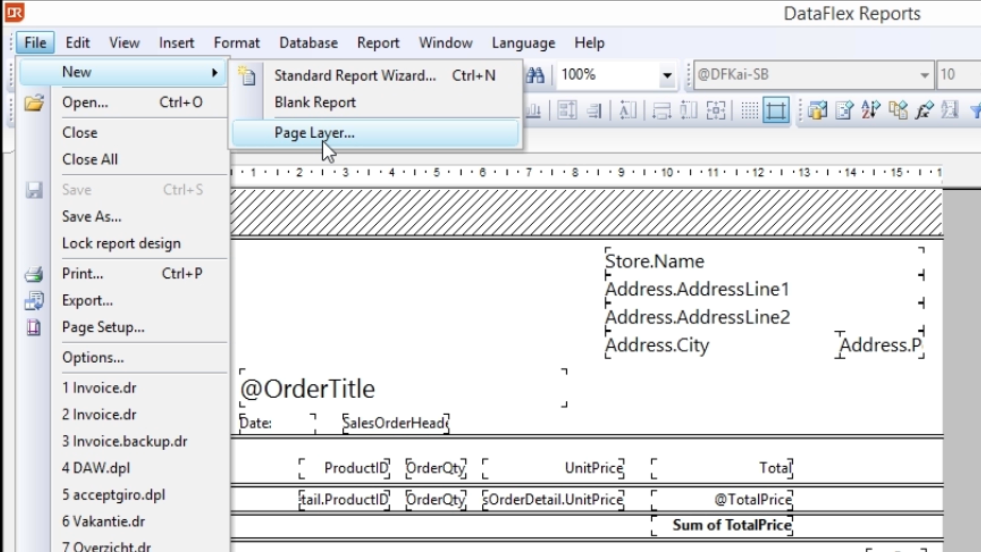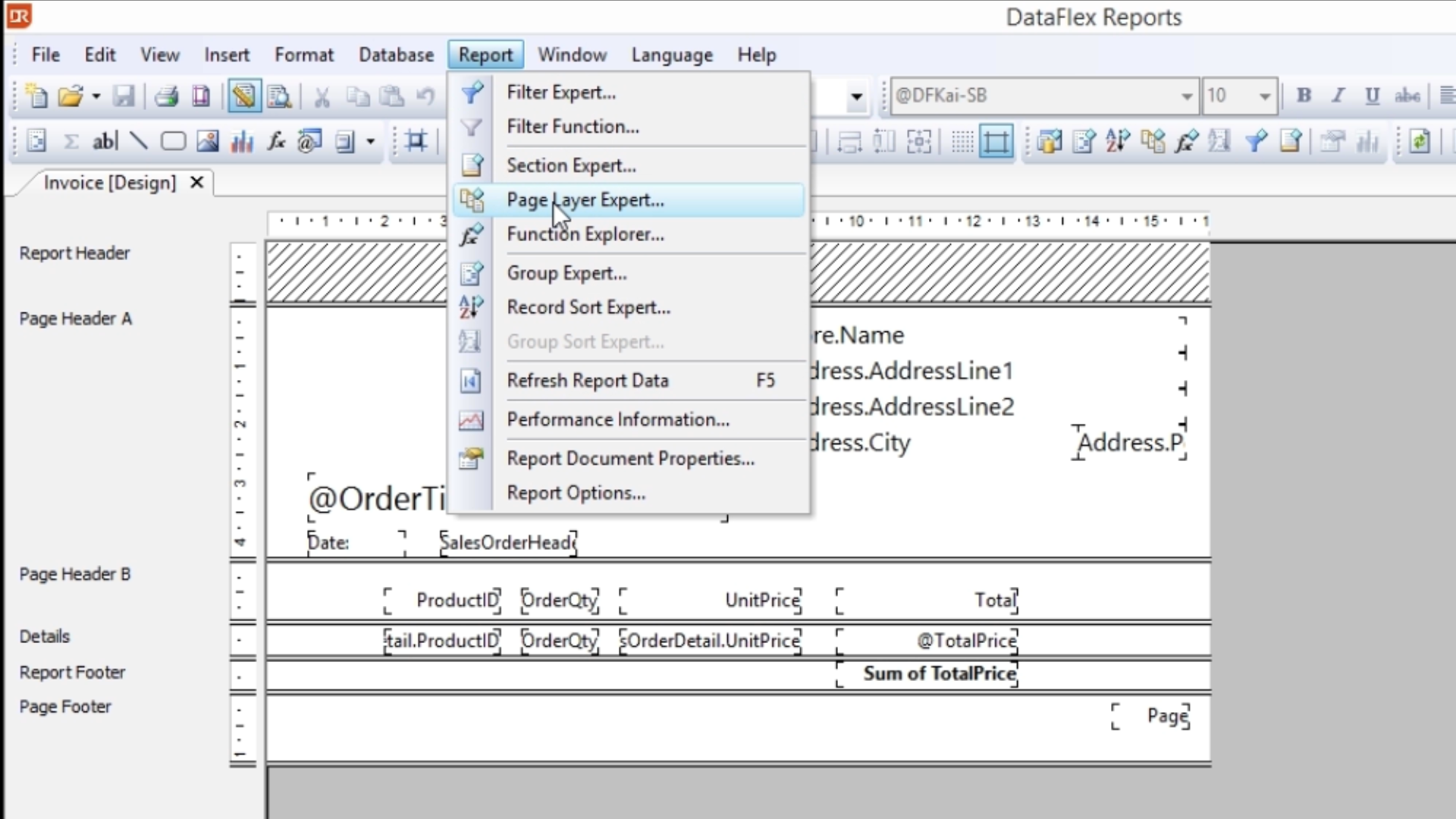 From the top menu select REPORT > PAGE LAYER EXPERT