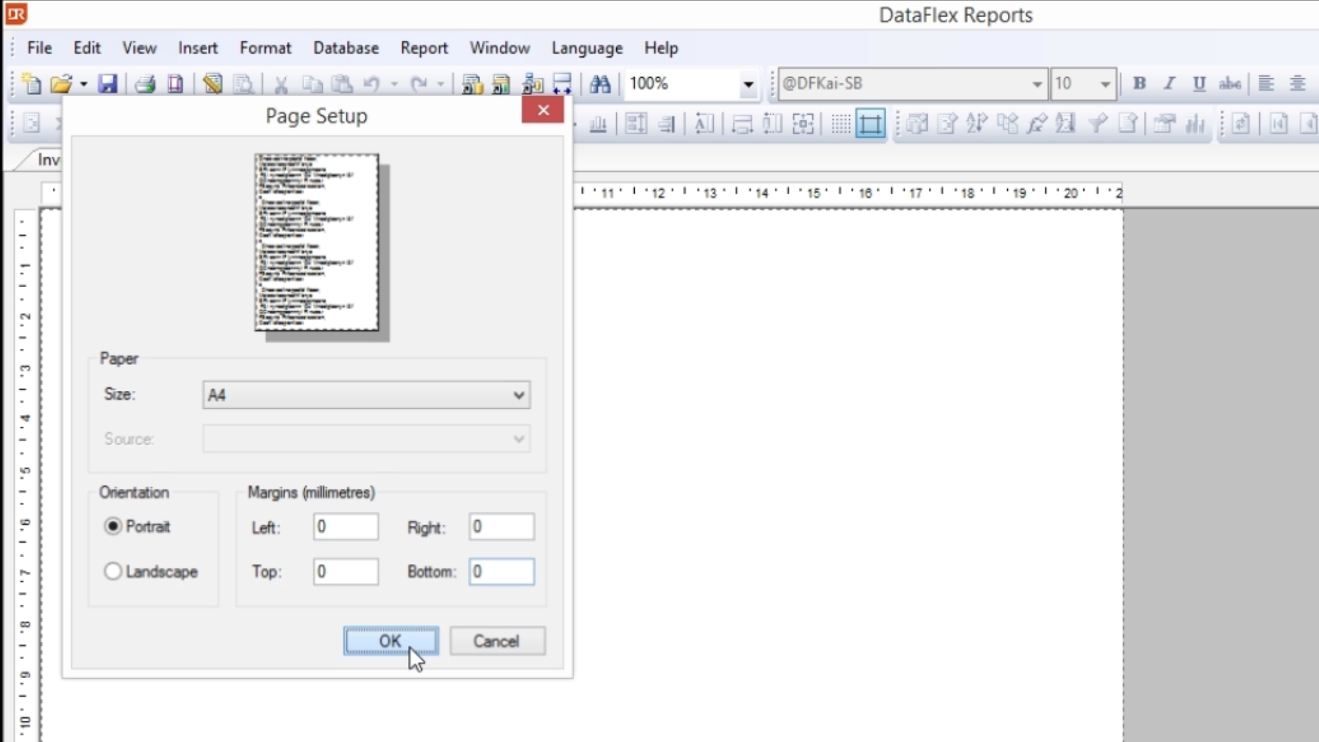 In the “Page Setup” window set the Left, Right, Top and Bottom margin measurements to 0. Select OK.