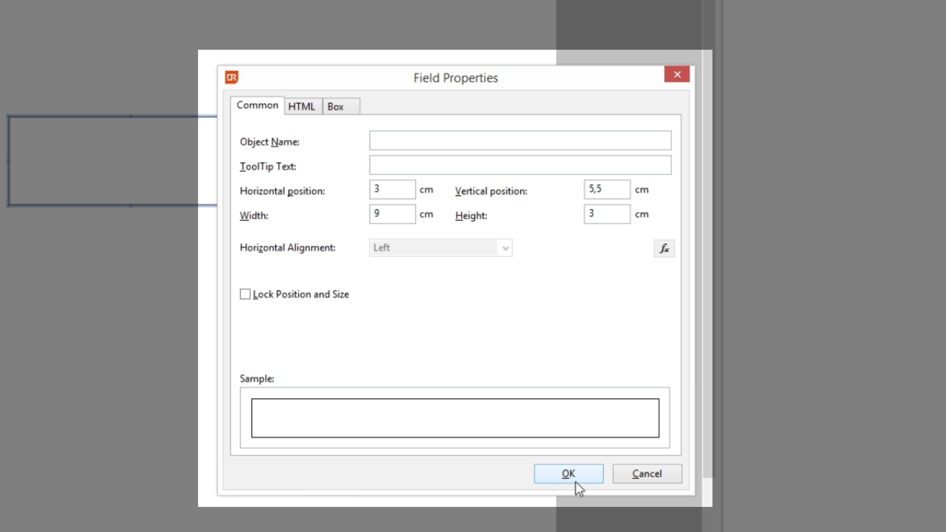 Right click on the box and select FIELD PROPERTIES to set the exact location and size for the envelope window. In this example… - Horizontal position: 3 cm - Vertical position: 5,5 cm - Width: 9 cm - Height: 3 cm