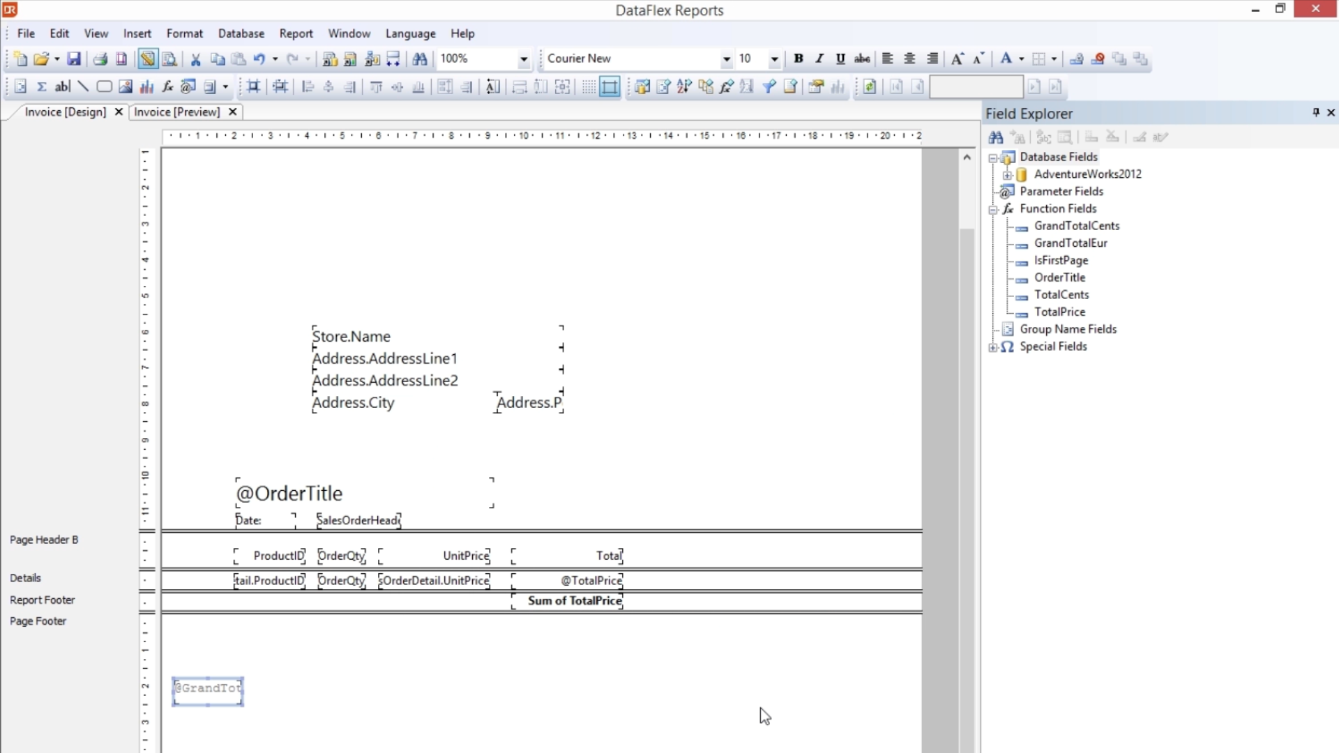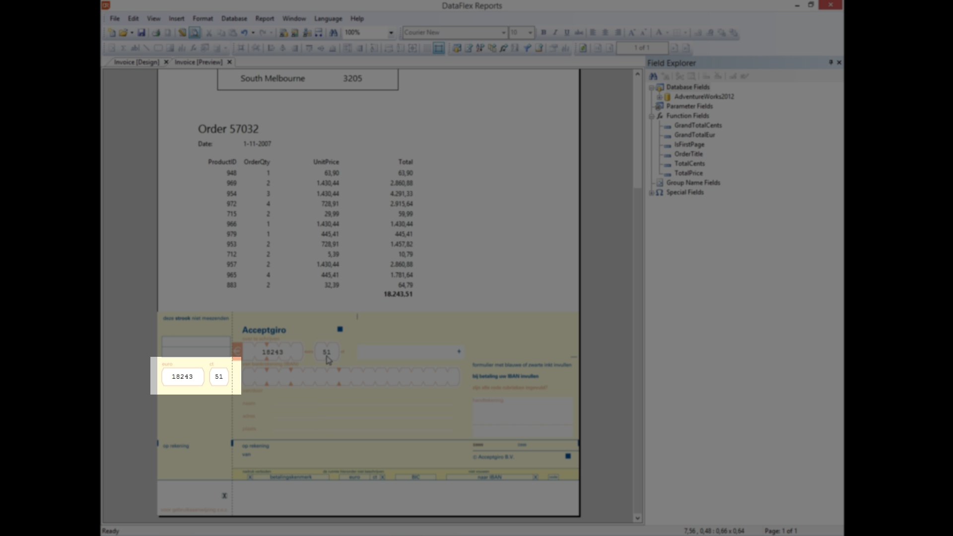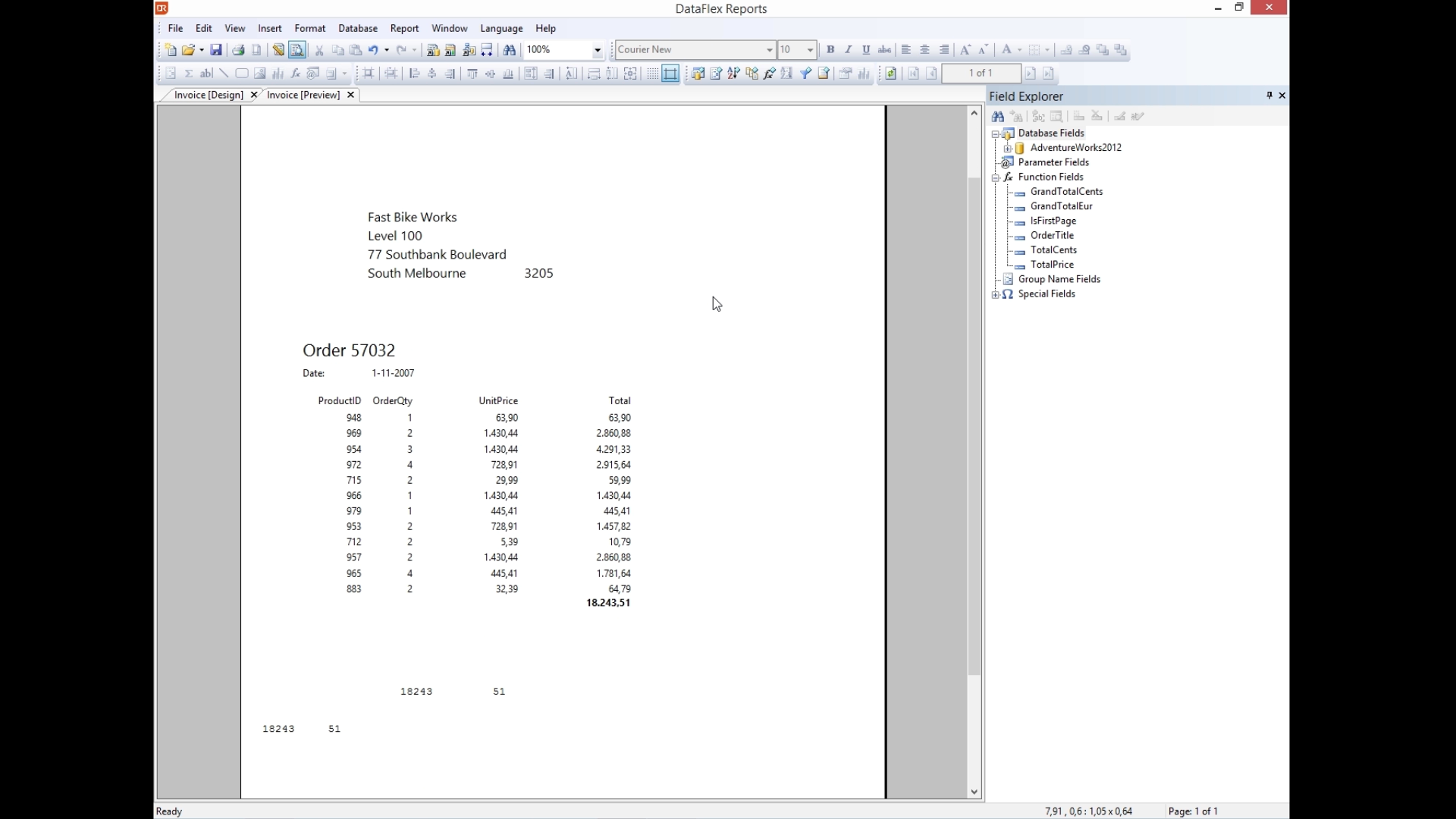 Add a new field to show the total amount of euros due by dragging the desired field (GrandTotalEur) from the menu on Field Explorer on the right.