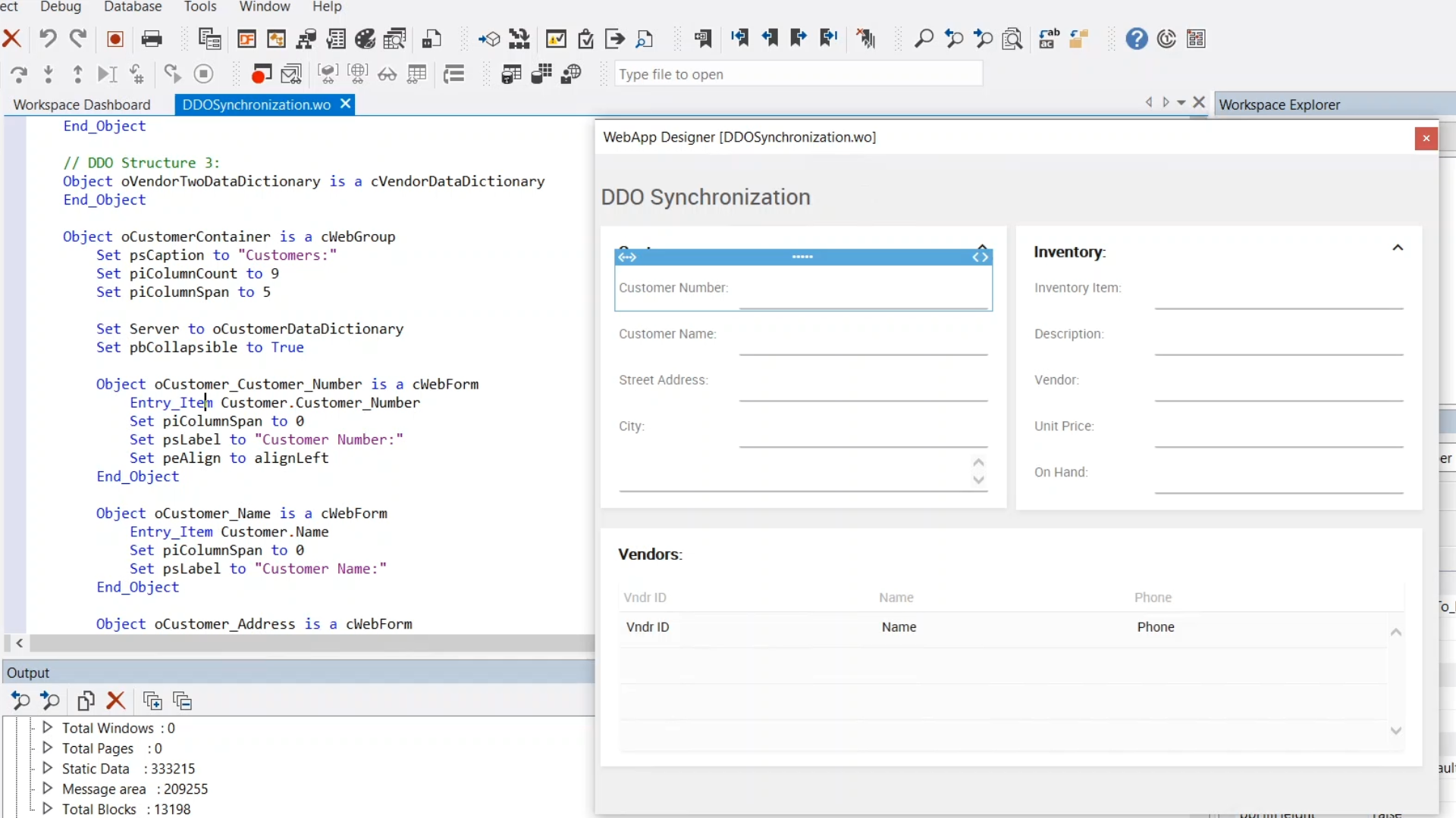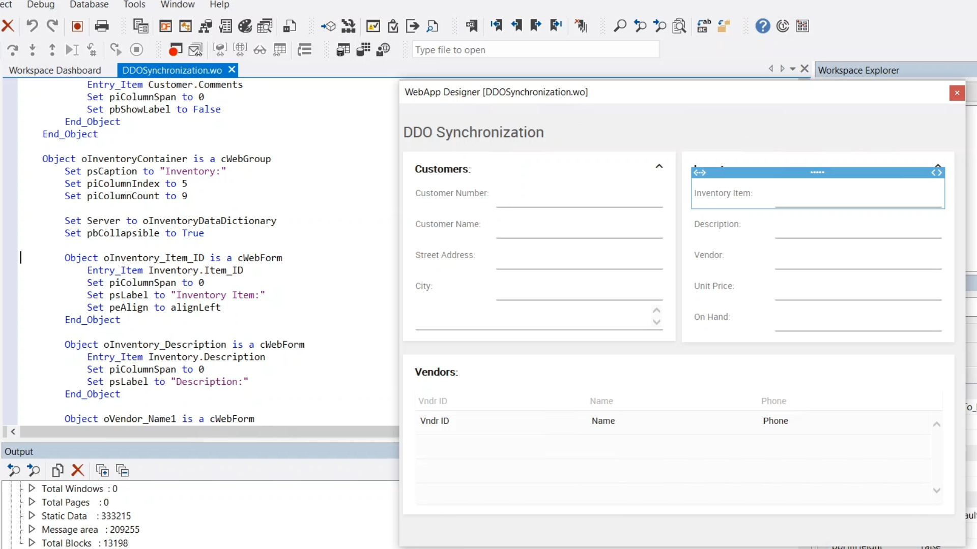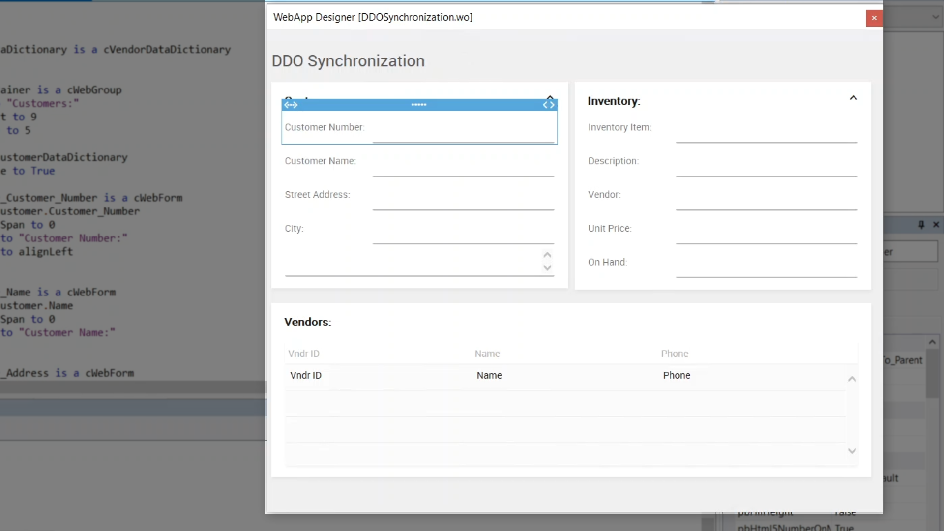 The Vendor field’s server is set to oInventoryDataDictionary. oInventoryDataDictionary and its server oVendorDataDictionary are a separate DDO structure within the view.