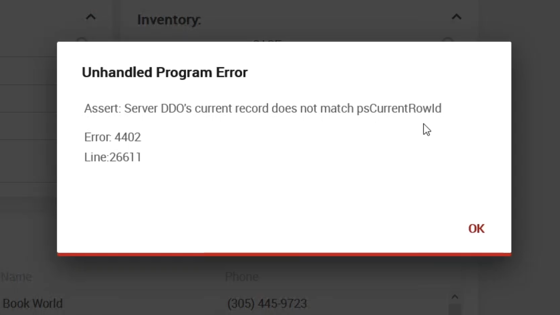 A grid or list keeps track of the current record. The error shown states that the current record of the list does not match the current record of the Data Dictionary. This is the same problem that was happening with the Inventory group, but with lists, errors are shown.