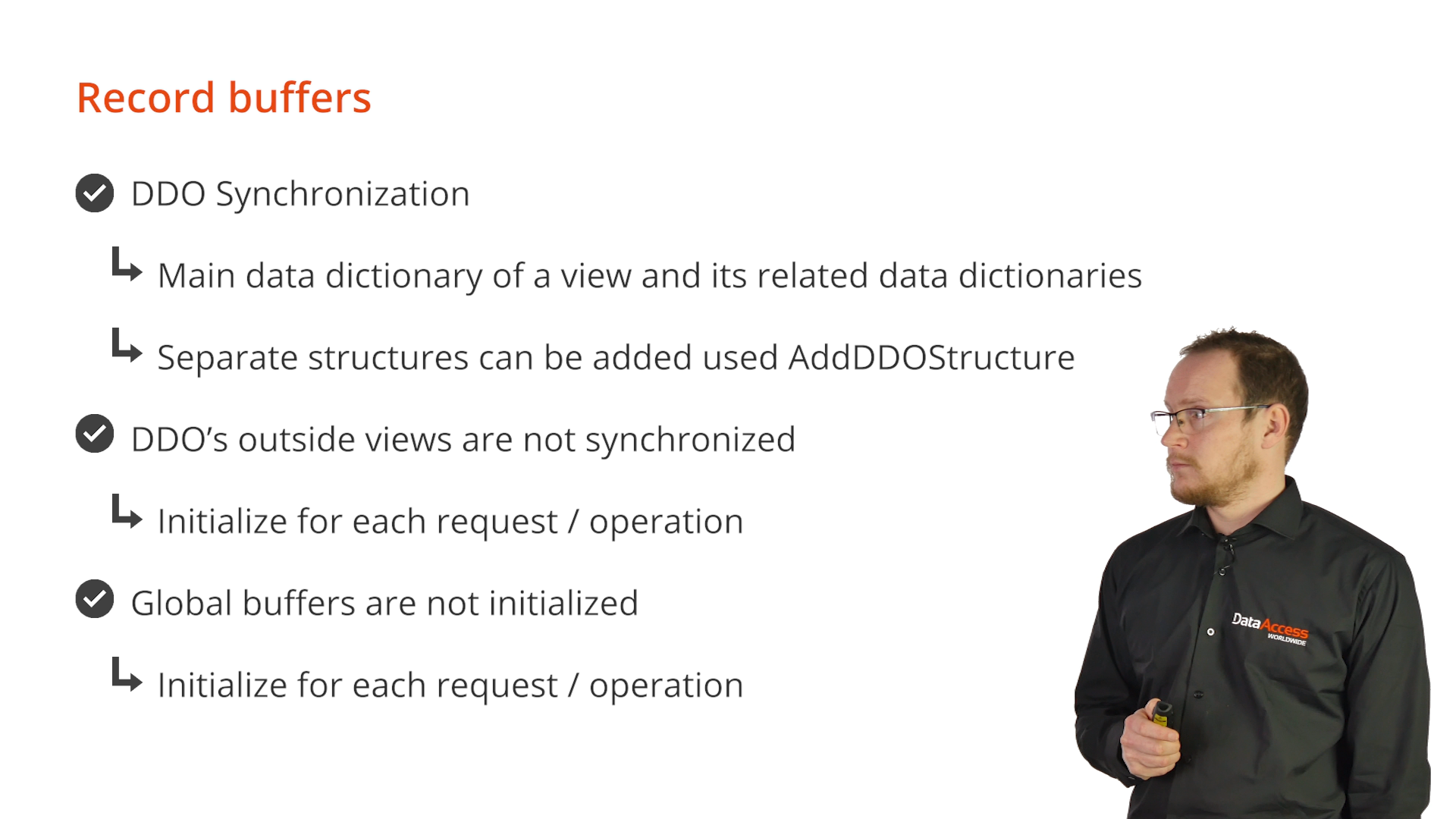 Data Dictionary Objects outside of views are not synchronized. Therefore, they need to be initialized for each request or operation. The same needs to be done for global buffers because they are not initialized unless they are used through Data Dictionaries.