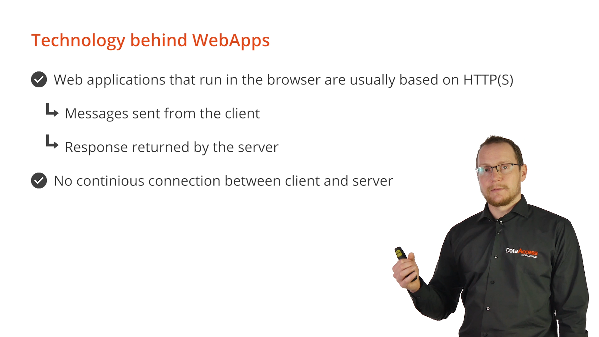 WebApps that run within browsers are usually based on HTTP(S) protocols. These protocols consist of messages being sent from the client to the browser, then to the server, and the server sends back a response. There is no continuous connection between the client and the server.