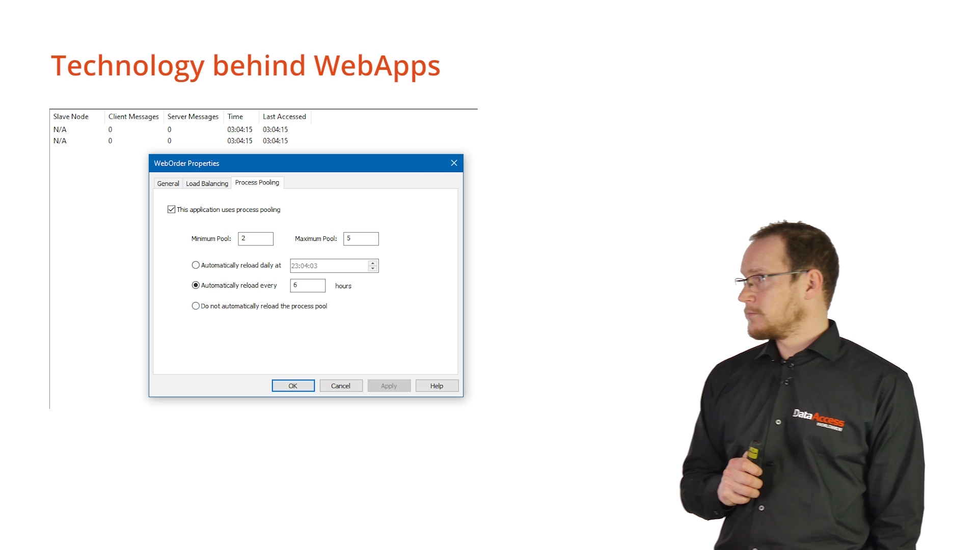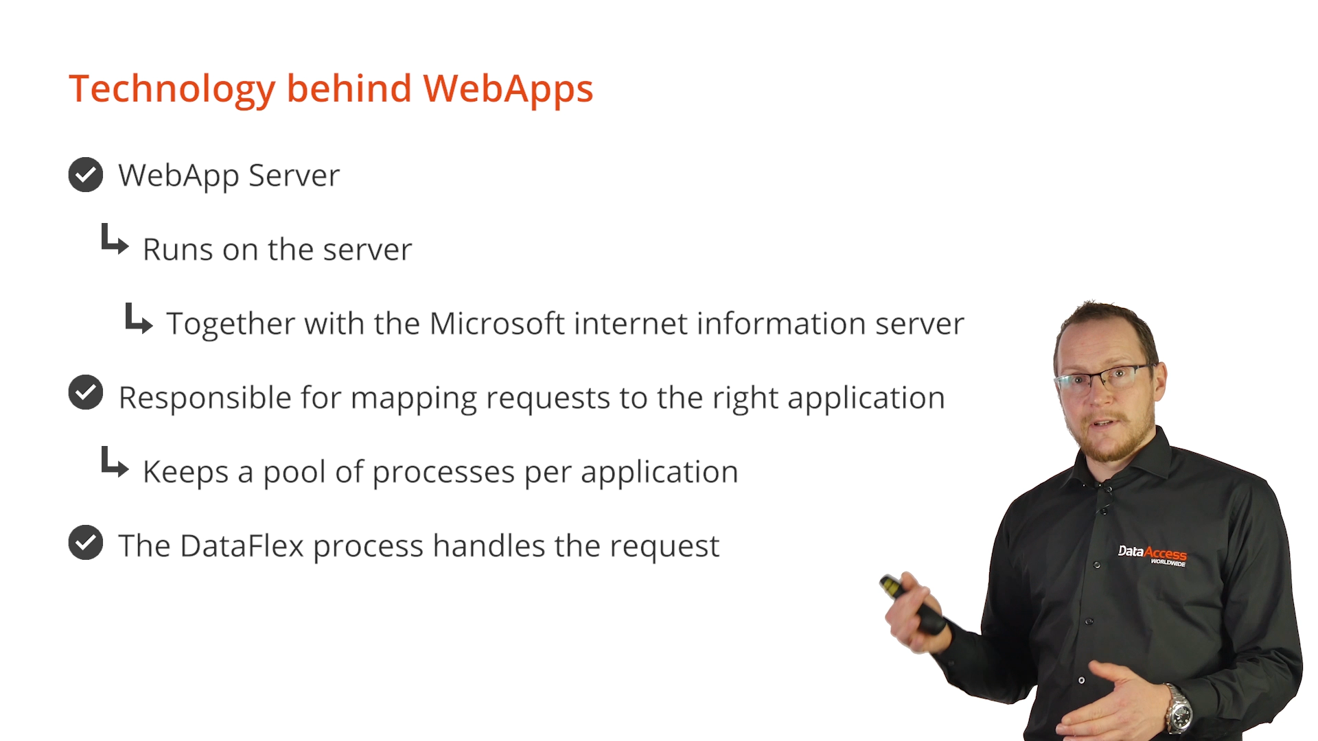 The WebApp Server runs on the server with the Microsoft Internet Information Server (IIS), and is responsible for mapping requests to the right application. For each application, the WebApp Server has a pool of DataFlex-written processes that are available to handle the requests.