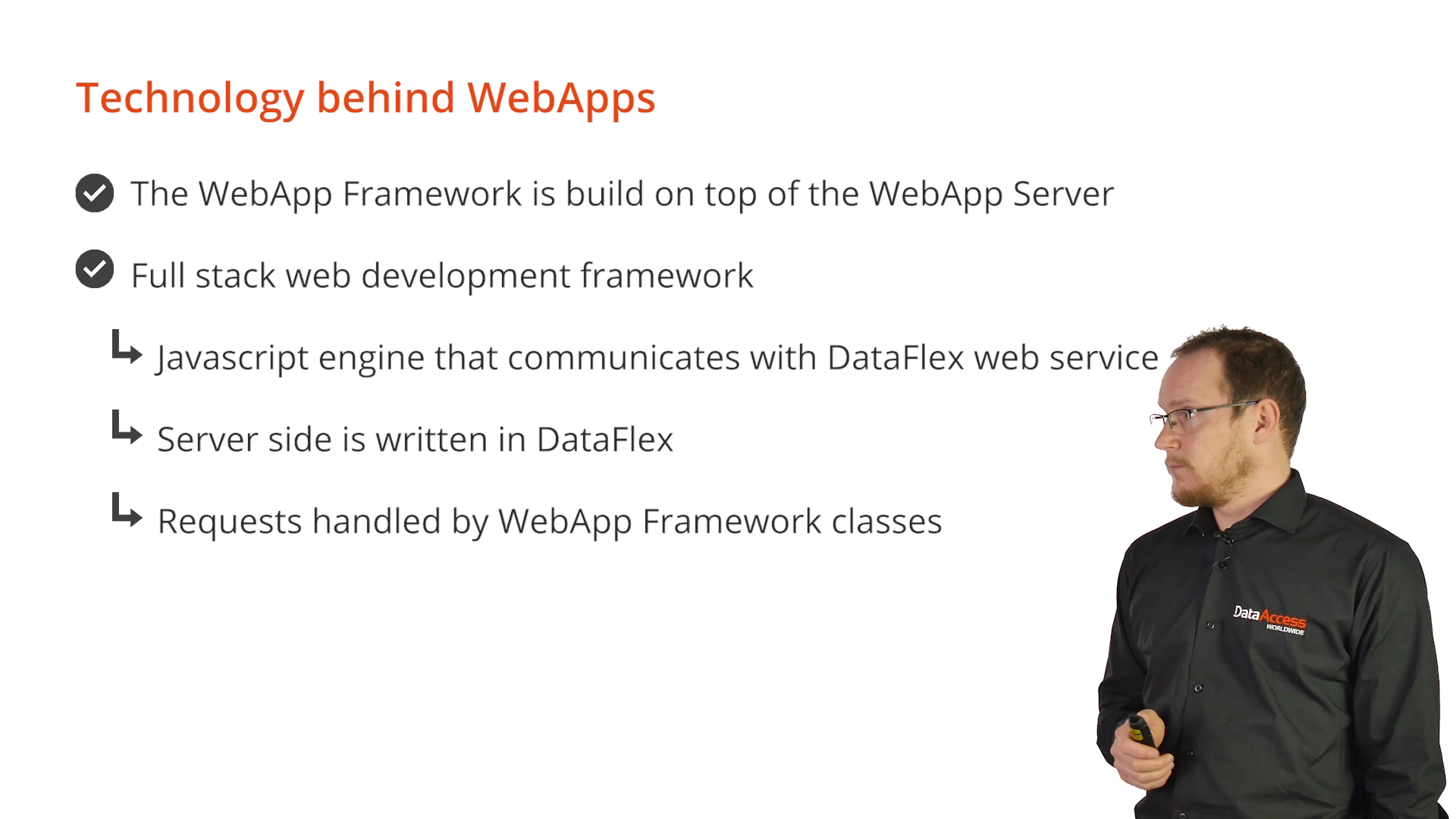 The WebApp Framework, which is a full stack web development framework, is built on top of the WebApp Server. The Framework is a JavaScript engine that communicates with a DataFlex Web Service. The DataFlex-written server side environment receives requests from the DataFlex Web Service. The requests are handled by the WebApp Framework classes, the response is sent back to the client, and the JavaScript engine running on the client knows how to handle the data.