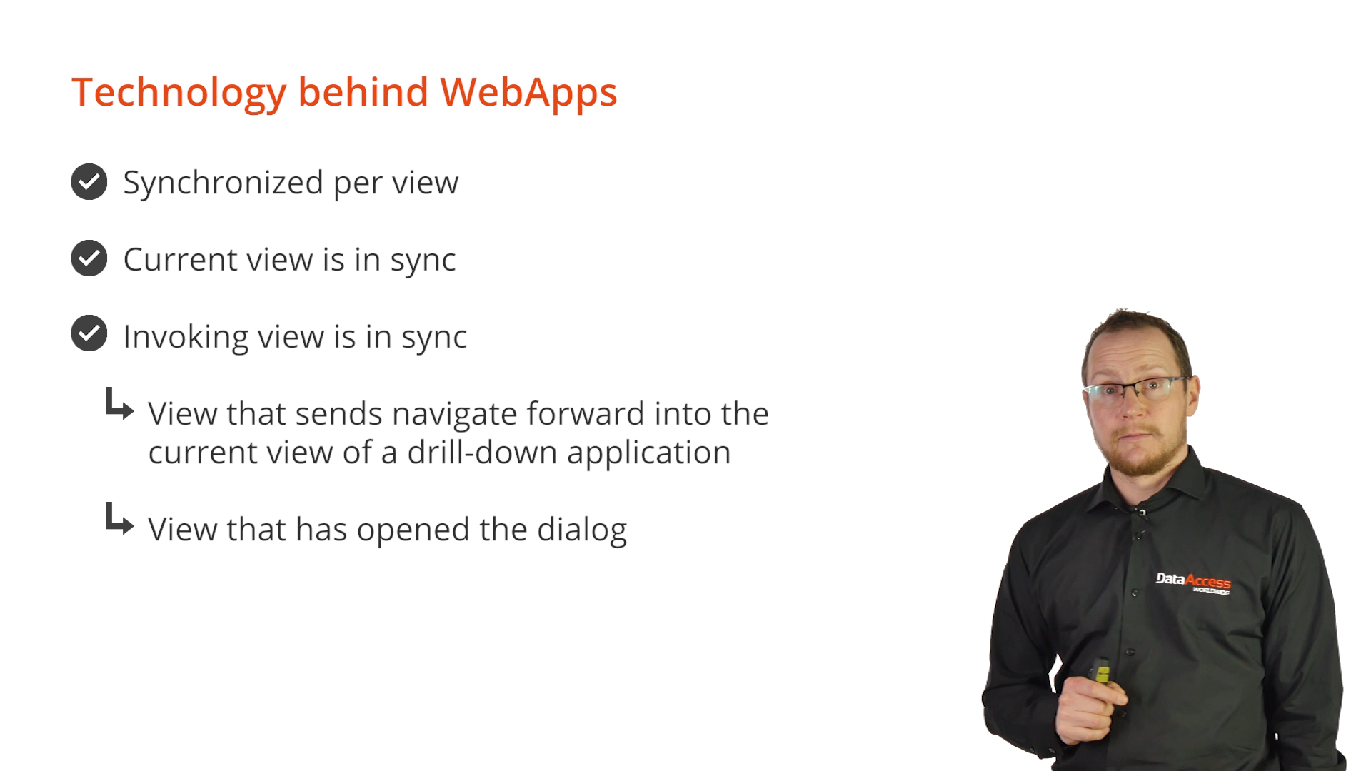 The synchronization that is done is per view. This means that not all views within the application are always in synch. This is an optimization because a request usually only involves a single view. The view that is currently open is in sync and is invoking views as well. For drill-down applications, the invoking view is the view that sends the navigate forward into the current view. For model dialogs, the invoking view is the view that has opened the dialog.