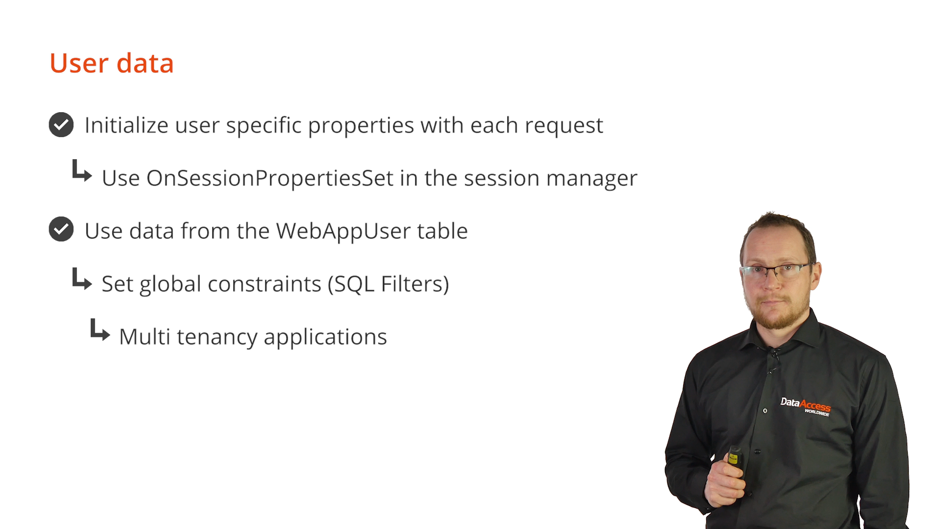 Parts of the web application that are for a specific user need to be initialized with each request. The OnSessionPropertiesSet iN the session manager is usually used for this. This is done after the session is validated and it is known if the user is logged in or not. If logged in the identity of the user is known. This means data from the WebAppUser table can be used to initialize local properties or to set global constraints (SQL Filters). For example, this would be done in multi tenancy applications with the OnSessionPropertiesSet.