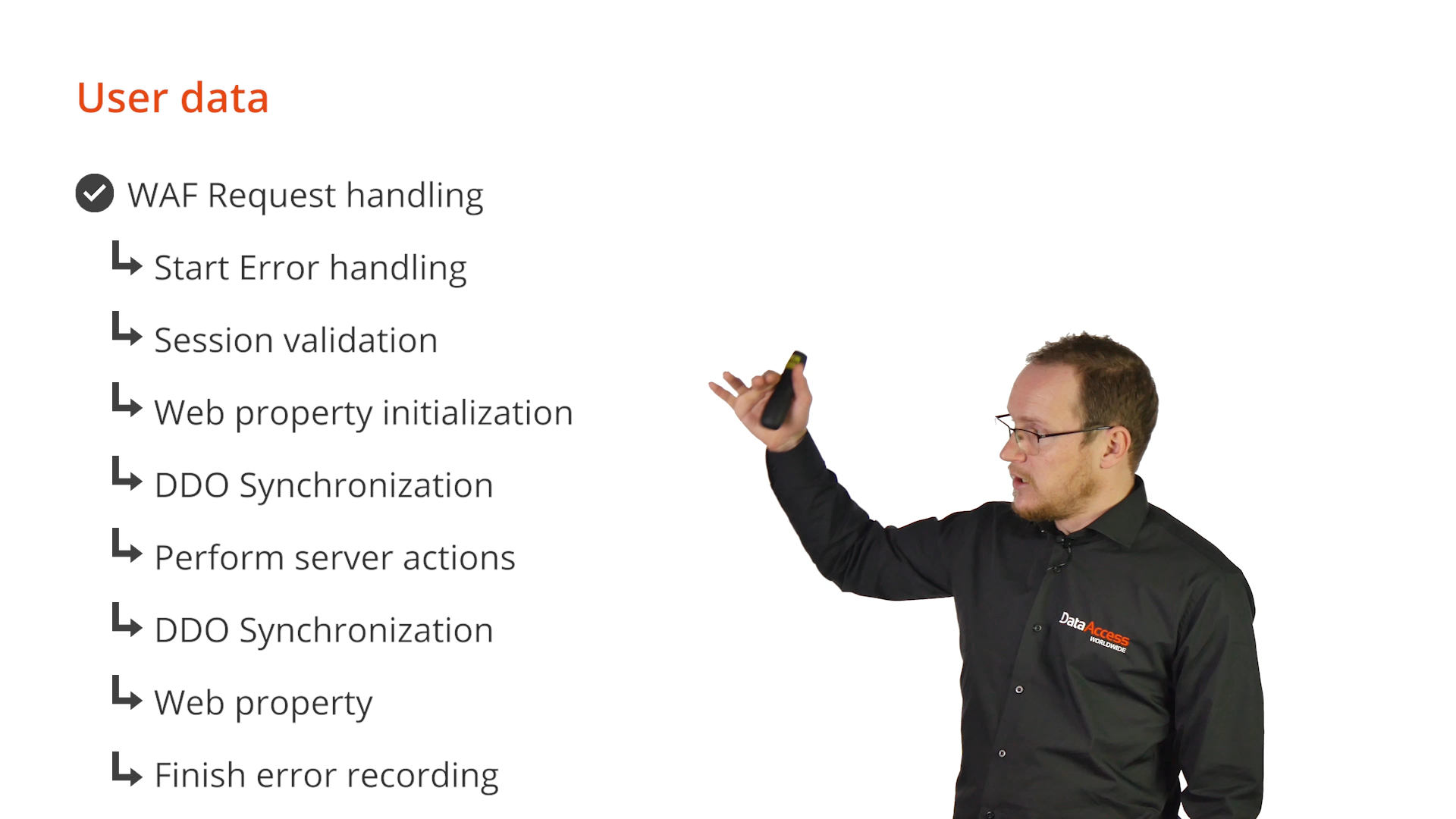 Revisiting the overview of request handling of the WebApp Framework, the session validation step first validates the session and then triggers the OnSessionPropertiesSet. This is where user specific events would be initialized. This is before the web properties system is initialized, meaning that web properties cannot be used at this point. If web properties are needed, OnSynch WebApp event that is fired during the DDO synchronization. It is fired before the DDO synchronization process has done anything, so it can be used to make global filters.