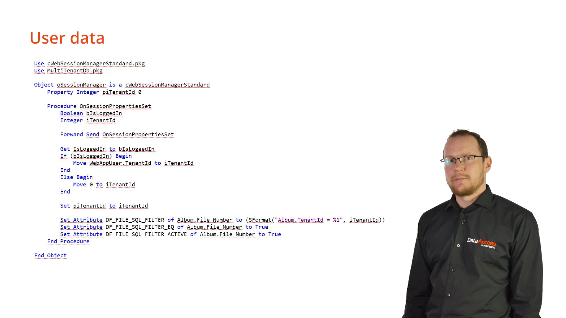 This sample code for a muti-tenant application shows, OnSessionPropertiesSet being implemented within the session manager. The WebApp user table has a field called ‘iTenantId.’ The data will be constrained based on the tenant ID. At the end of the procedure, a global SQL filter is defined that constrains ‘Album’ table on the specific tenant. The tenant ID is stored in a regular property. The property can be used later in the request handling to determine the current tenant.