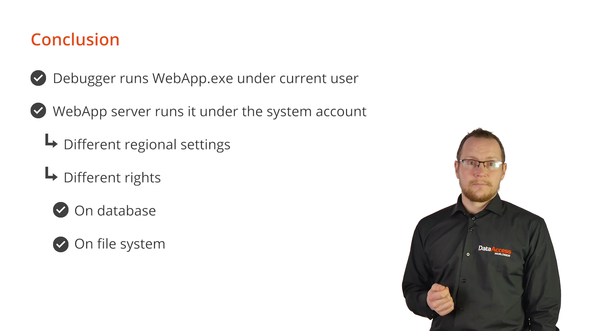 Running the Debugger can cause issues because it runs WebApp.exe under the current user. The WebApp server runs WebApp.exe under the system account.