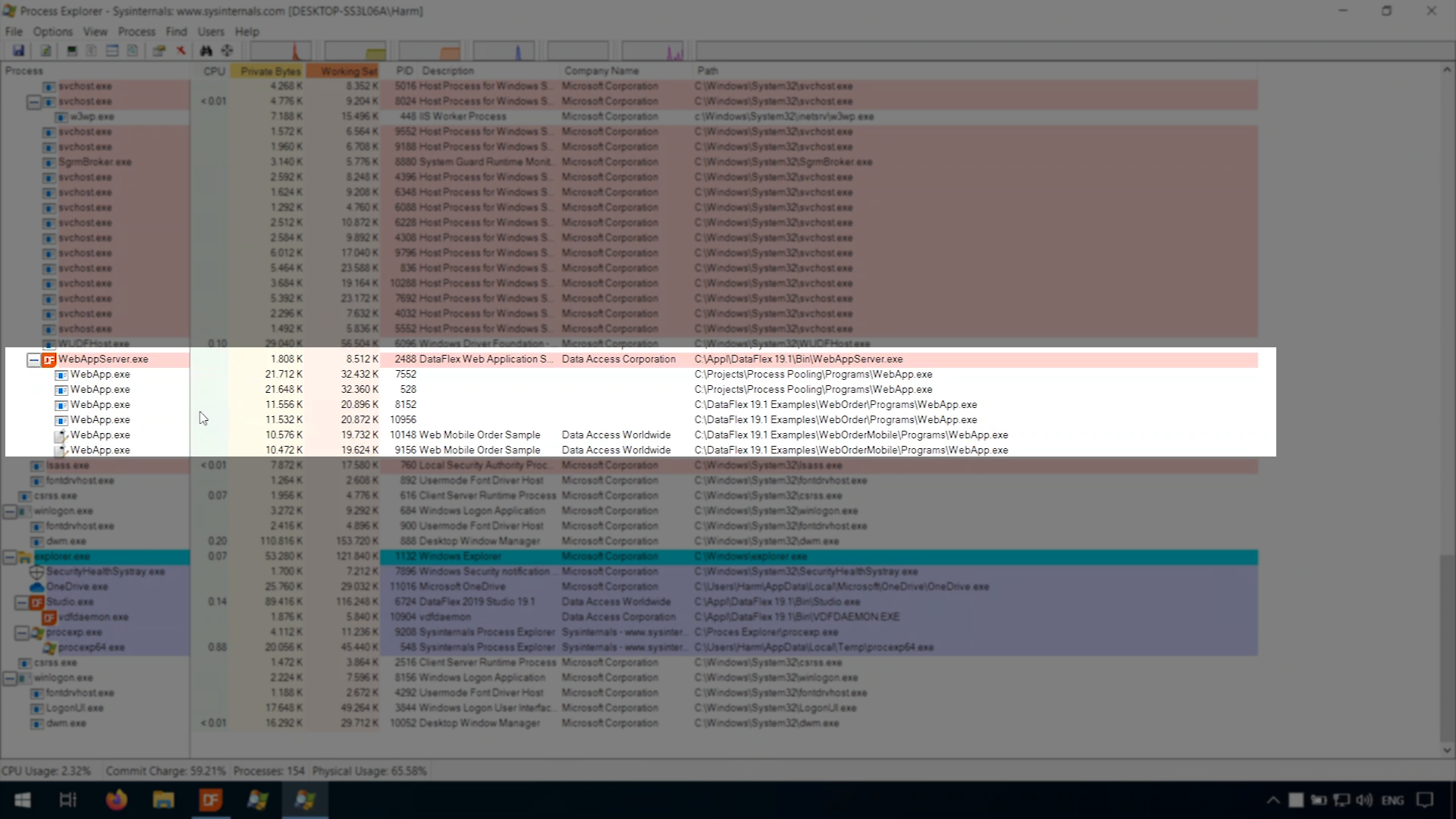 - Running the application and logging in shows in Process Explorer that the third process handled the login request. Next, a view was opened, and the first process handled the loading of the view.