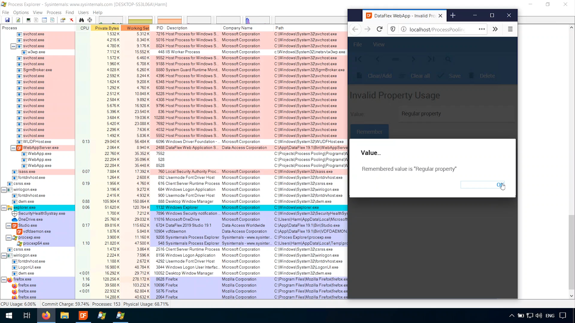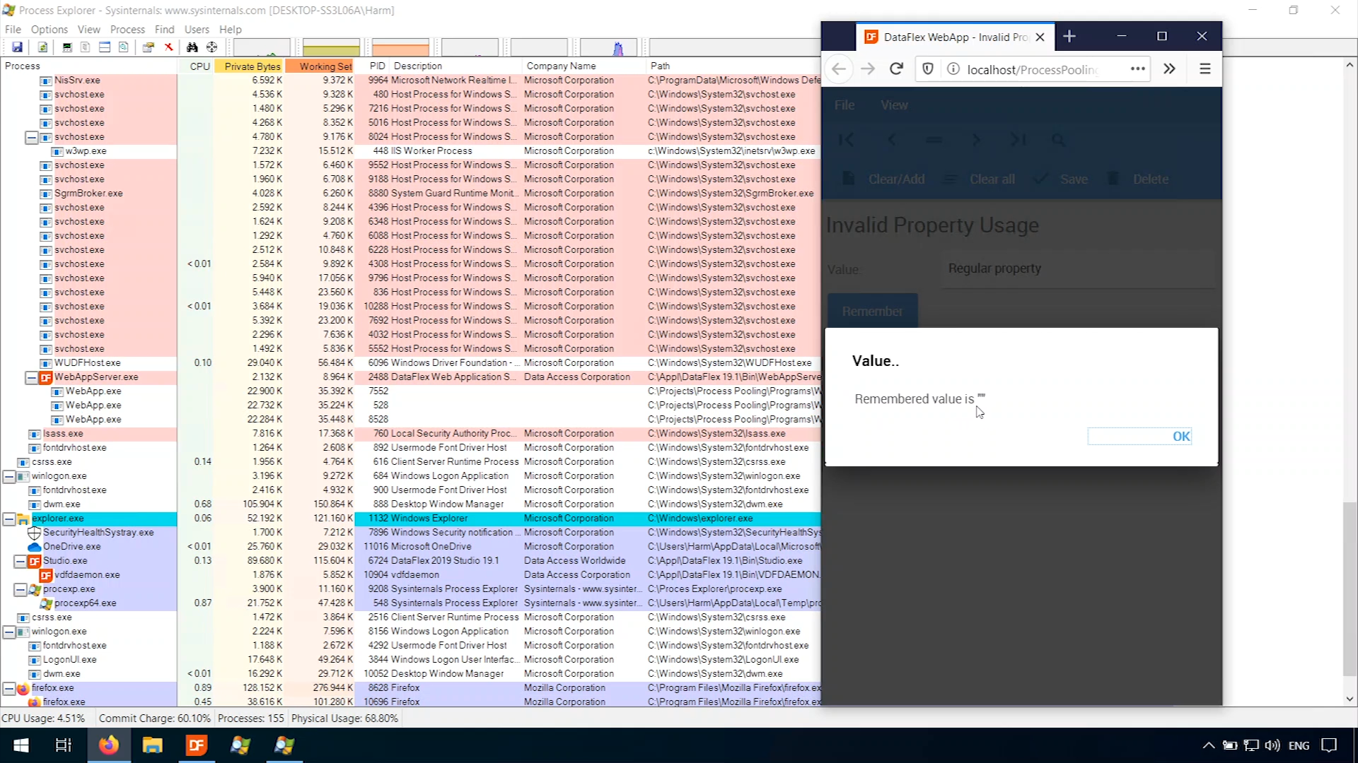 - Saving a value in the application with the ‘Remember’ button shows that the second process handled the OnClick. Clicking the ‘Display’ button initially does not return the value because it is being handled by the third process.