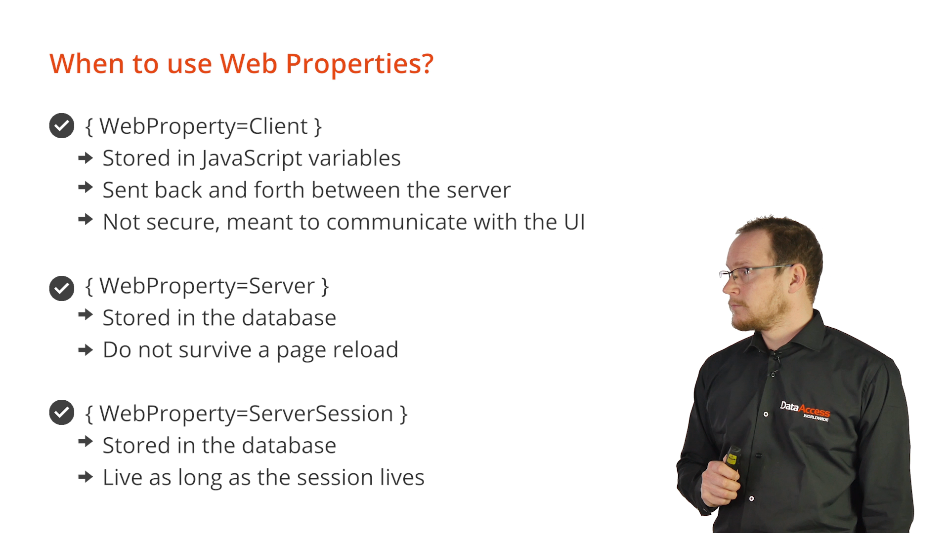 - Client WebProperty - stored on the client in a JavaScript variable. They are returned as a response to a request. Once changed at runtime they will be sent back and forth with each request between client and the server. They are expensive and insecure. Their main purpose is to communicate with the user interface.