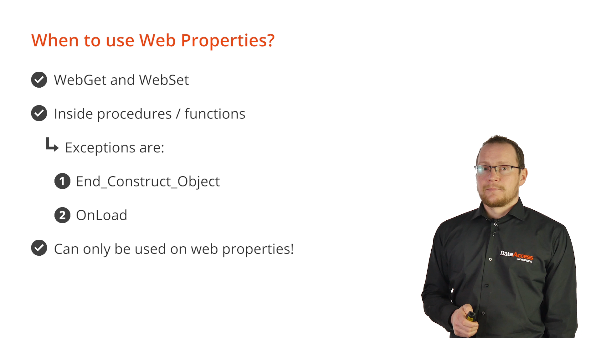 - When a WebProperty is used inside a procedure, WebGet and WebSet should almost always be used with the exceptions of…