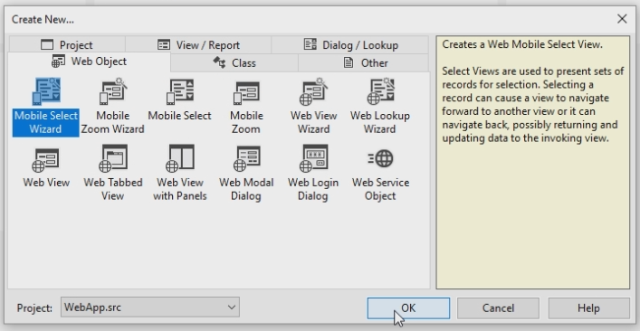 Click Create New… and select the Mobile Select Wizard.
