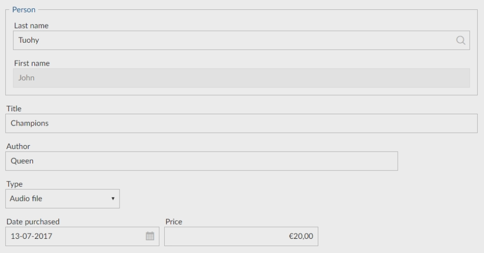 Click the Add button to create a record, enter the following data: - Select the person: John Tuohy - Title: Champions - Author: Queen - Type: Audio file - Date purchased: 13-07-2017 - Price: €20,00