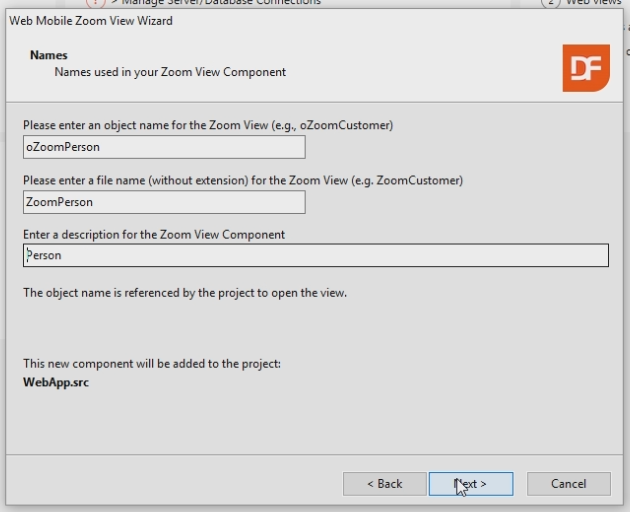 Enter the name of the view, this name will be oZoomPerson. Leave the filename as is. Change the description to Person. The description will also be the caption of the view.
