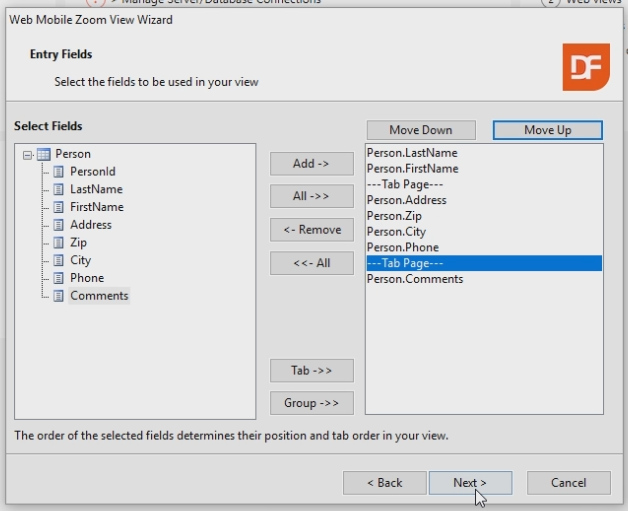 Add the following fields of the Person table to the view. Add: - LastName - FirstName - Tab page - Address - Zip - City - Phone - Tabe page - Comments