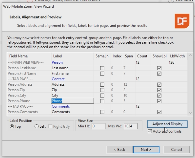 After clicking next, the labels can be changed. Change them to: - LastName: Last name - FirstName: First name - Tab Page Label: Contact - Tab Page Label: Comments