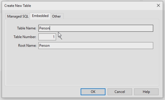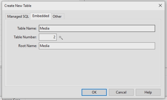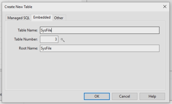 - Create another table by clicking the Create new Table button. This table is a technical table, that will be used for auto numbering fields and several other configuration options. Call the table SysFile.