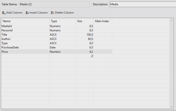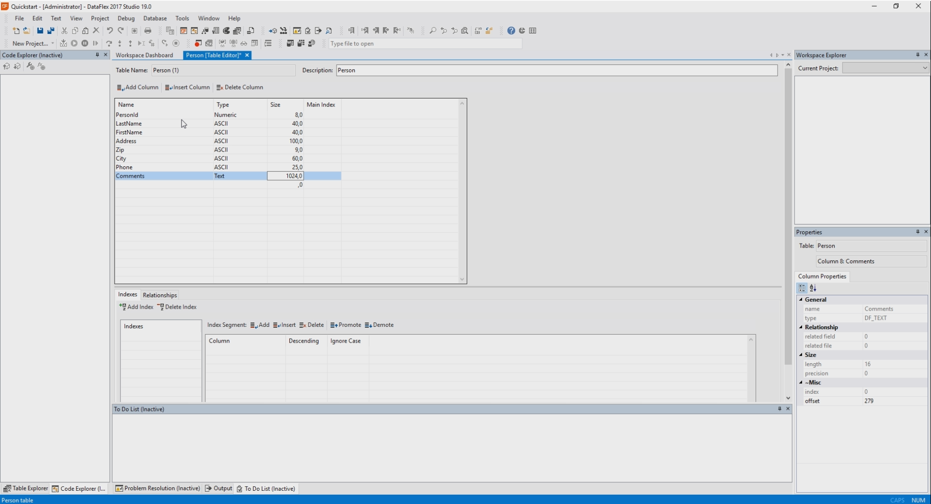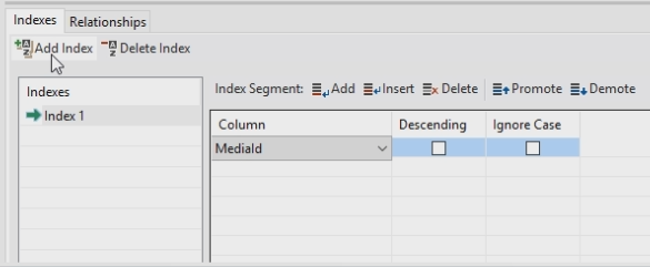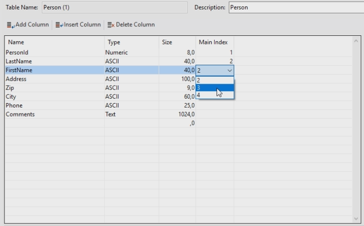 - Define the indexes. These are used to determine how DataFlex is going to sort the data. The first step is always to create a unique index on the primary key of the table. In this case PersonId. Click Add Index, select PersonId in the Column field.