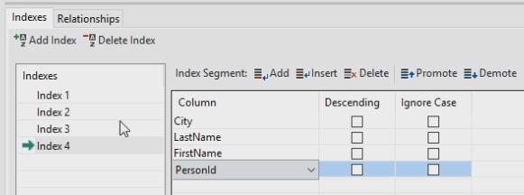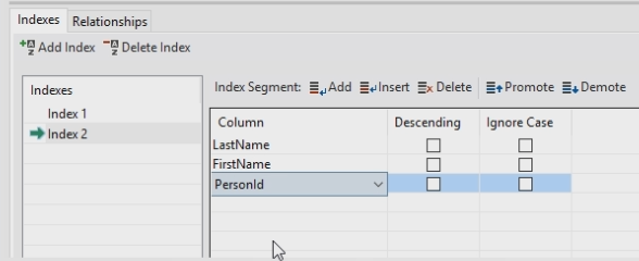 - Create another Index. Select LastName and FirstName. In this case you will be able to sort on LastName and FirstName. To make it unique select PersonId.